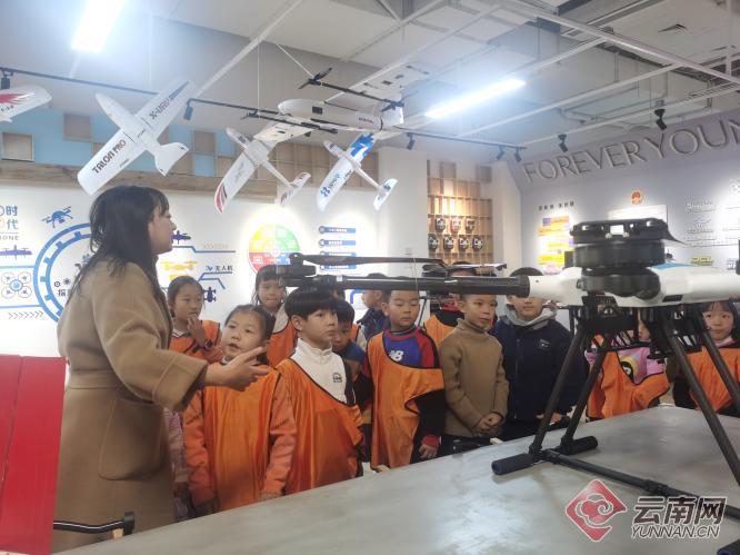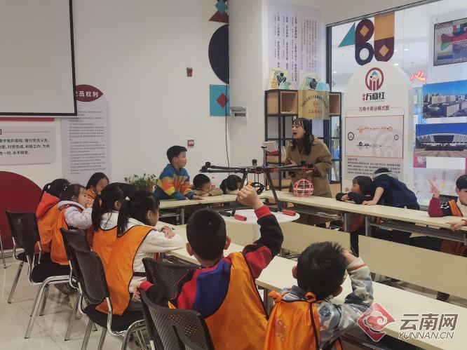 在呈贡区吾悦广场的党群服务中心里,一堂生动的无人机观摩课正在进行。教师是吾悦广场里无人机培训机构的教师,学生是呈贡区春悦社区寒假托管训练营项目的33名儿童。