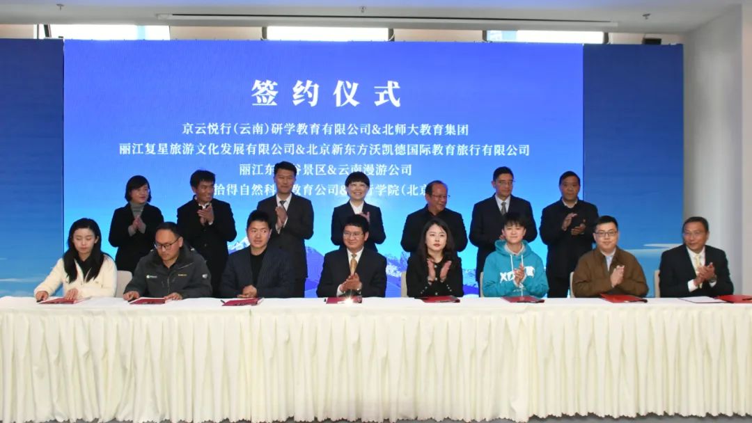 发布会现场,北师大教育集团与京云悦行(云南)研学教育有限公司、丽江复星旅游文化发展有限公司与北京新东方沃凯德国际教育旅行有限公司、丽江东巴谷景区与云南漫游公司、拾得自然科技教育公司与童行学院(北京)分别签订战略合作协议,各方将在研学旅行课程研发、体系建设和标准制定、市场推广和营销活动等方面开展合作。