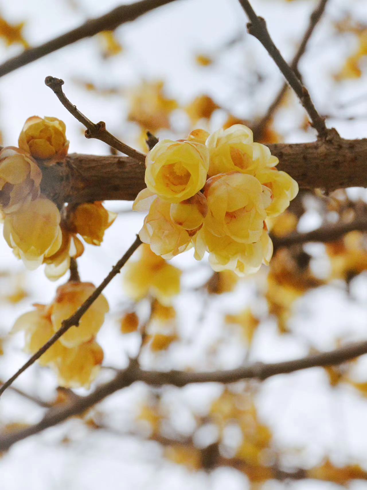 花开自有期,绽放亦有时。花朵比人更能感知节气的变化,赏花人唯有早作安排,才不会错过花期。每到年前,我就记挂蜡梅是否应期开放,索性挑一个清闲的日子来到玉龙县世遗公园探花。来到园中,发现今年的蜡梅花开得比往年早,给冬日的公园增添了一抹俏丽的亮色和淡淡的香味。它不与绿柳争宠,默默地装点着寒冬,天越冷开得越香。一颗颗错落有致的花苞点缀在褐色的枝条上,有的半开,有的迫不及待地吐露初蕊,小巧又迷人,正待赏花人寻香探踪。蜡梅的花瓣呈黄色,摸上去有种蜡质感。虽然名字中有“梅”字,却与我们熟知的梅花不同。冬日围坐小炉,丢两三颗蜡梅花苞入茶,茶香与蜡梅冷香完美结合,迷醉了寒冬,也温暖了岁月。