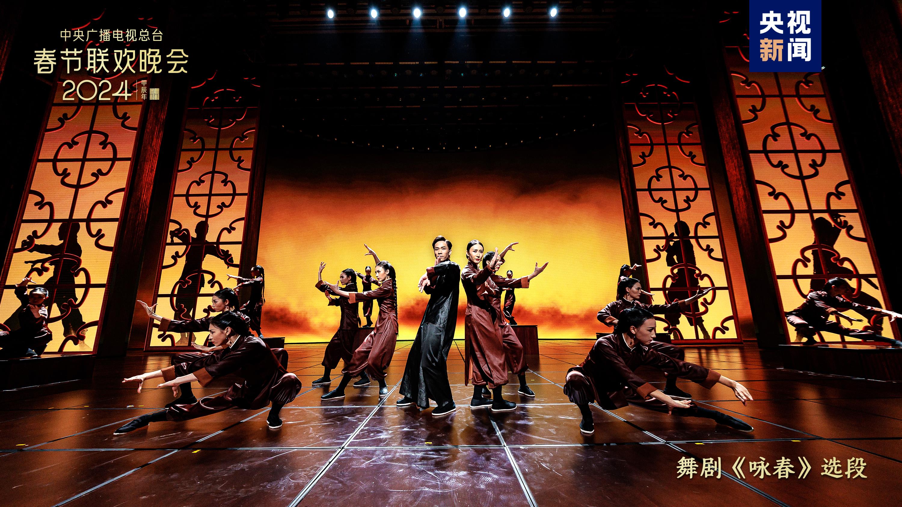舞剧《咏春》选段配以剪影的舞台呈现效果,以“舞”演“武”,动静皆宜,行云流水。舞蹈《瓷影》生动演绎瓷器的诞生过程,清新脱俗的青白之色定格光洁温润的东方美。功夫微电影《争春》融合重庆铜梁非遗龙舞,再现中国武术经典招式,三龙聚首共贺新春。