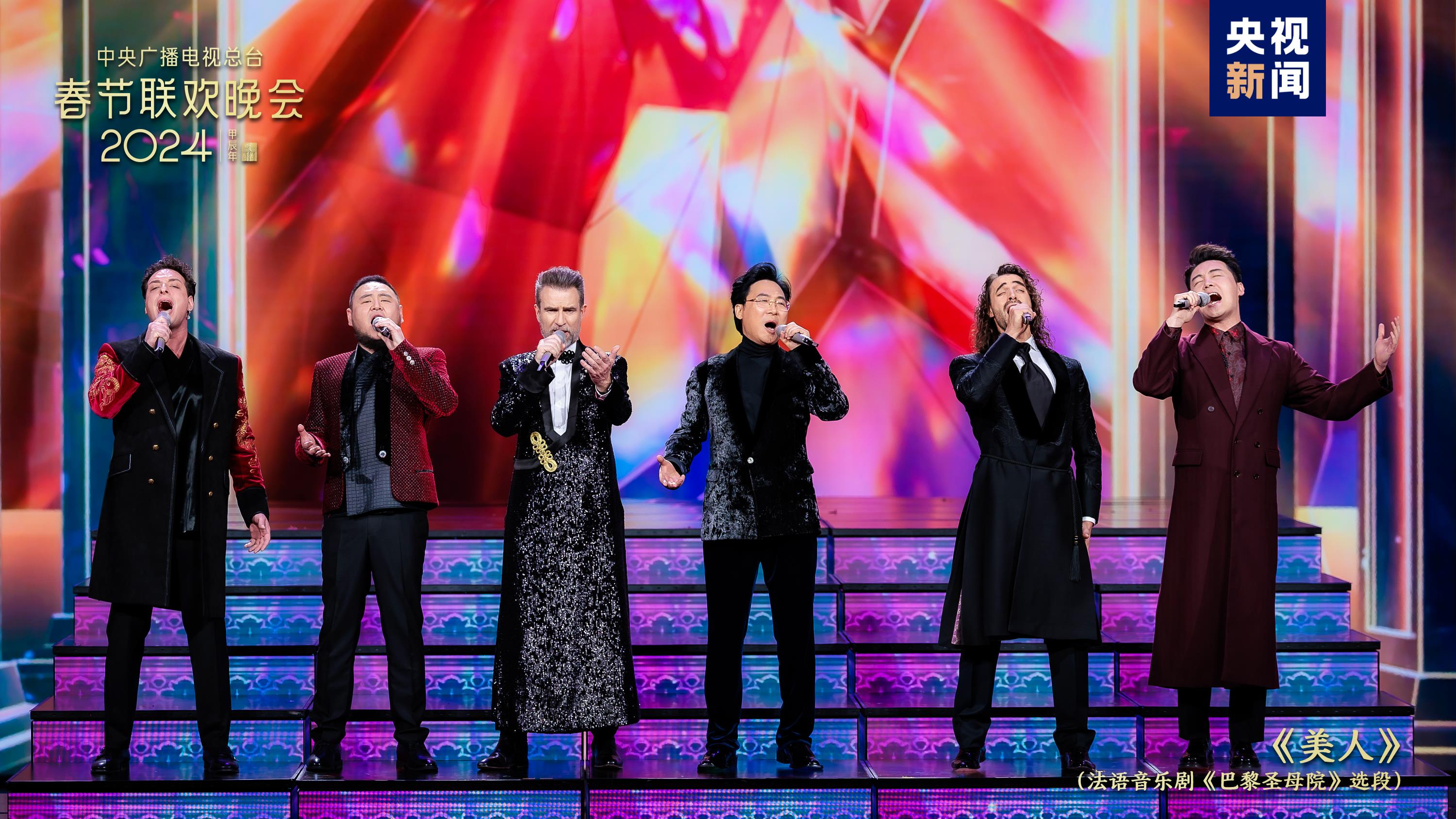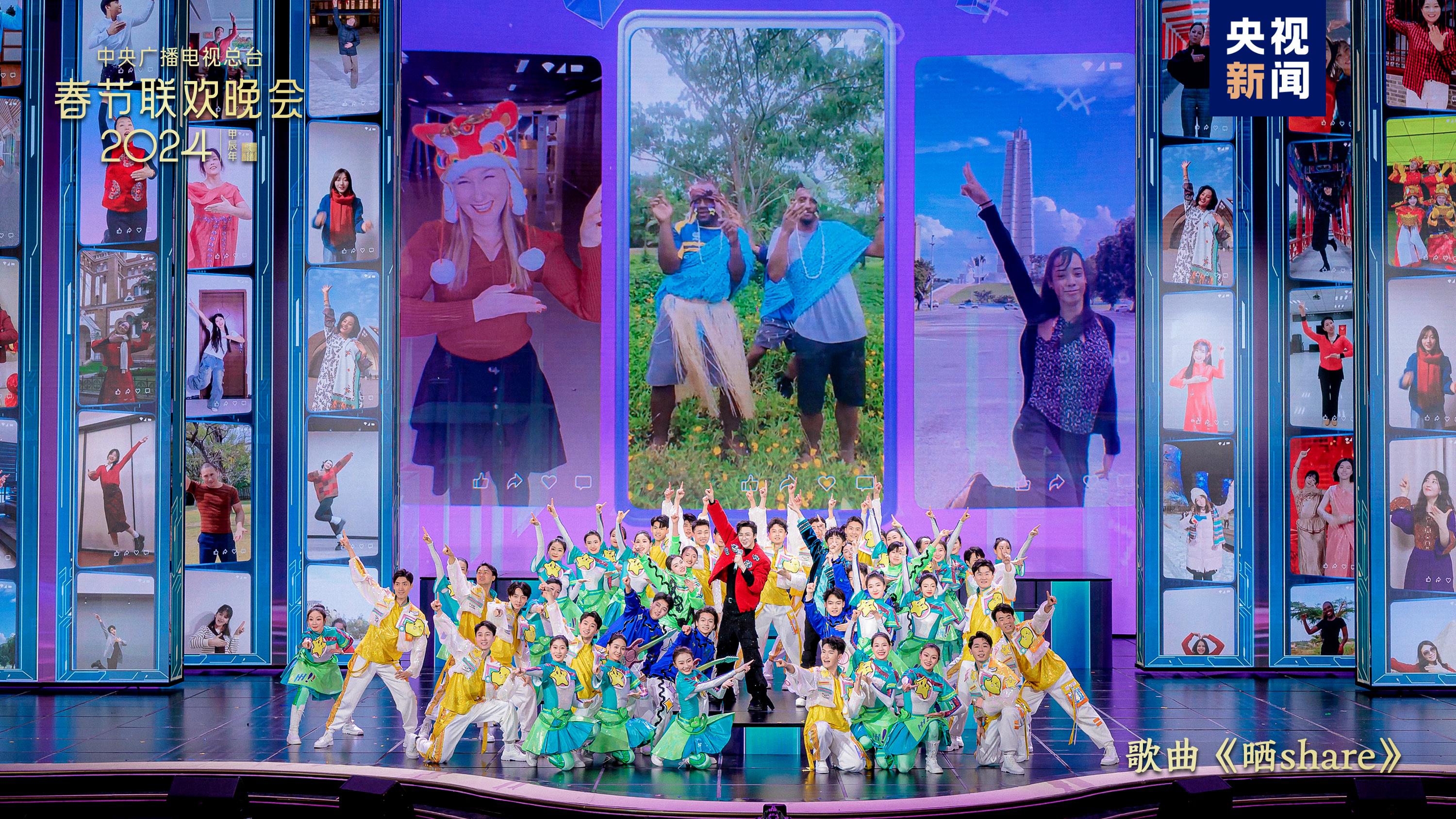 伴着一曲动感快乐的《晒share》,大张伟、刘宇宁与全球网友联屏共舞“龙年主题舞蹈”,分享春节的喜庆欢乐。这支舞蹈来自总台在海内外社交平台发起的龙年主题舞蹈挑战赛,目前已吸引68个国家和地区的网友热情参与,全球阅览量超5.89亿。今年正值中法建交60周年暨中法文化旅游年,索拉尔、廖昌永、吉安·马可·夏雷提、张英席、安杰洛·德尔·维奇奥、袁岱等中外艺术家共同演绎《美人》(法语音乐剧《巴黎圣母院》选段)。全球共舞,以歌会友,总台春晚用文艺精品促进文化交流互鉴,让美美与共的文明百花园生机盎然。