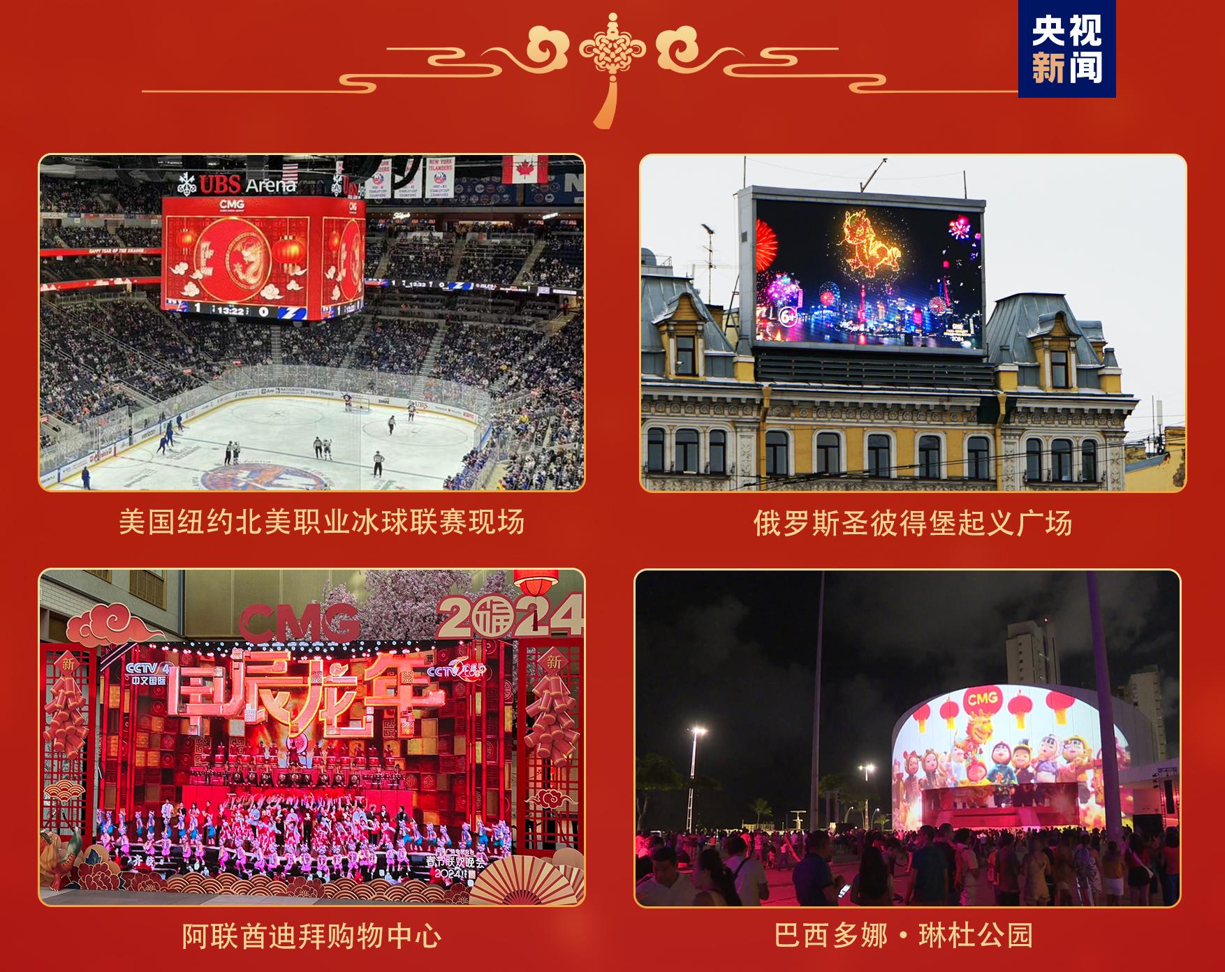 全球看春晚。作为联合国大会将农历新年列为联合国假日后的首个新年,总台主办的“春晚序曲 全球看春晚”活动在美国、肯尼亚、瑞士等多国举办近40场;各大洲49个国家、90座城市的3000余块公共大屏直播和宣介总台春晚;世界最高建筑迪拜哈利法塔、非洲第一高楼埃及新行政首都中央商务区标志塔、瑞典斯德哥尔摩市中心国王花园广场、巴西多娜·琳杜公园等多个全球地标性建筑上演春晚灯光秀……灵动吉祥的“龙辰辰”将中国新年的美好祝愿传遍全球。