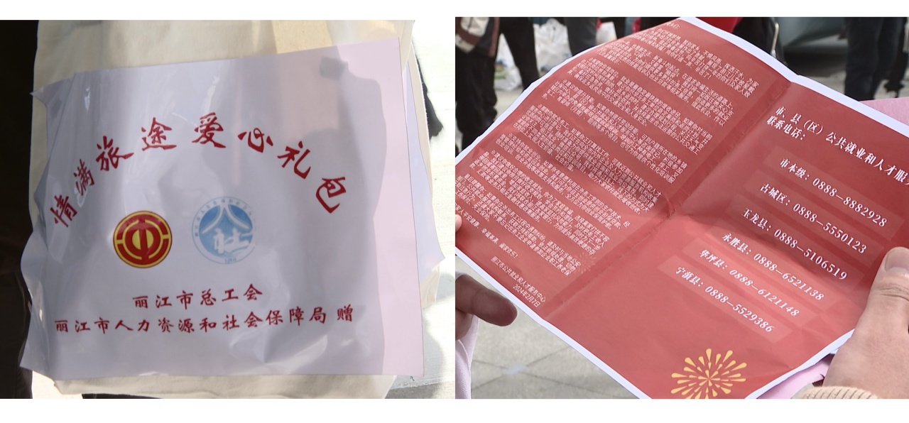 为了让大家能够安心打工,丽江各县(区)也是使出了浑身解数,为务工人员发放交通补贴,统一安排车辆,把大家从“家门口”接到“车门口”,并送到“厂门口”,还贴心准备了出行礼包。打开礼包记者看到,里面有牛奶、面包、方便面和矿泉水,还有致务工人员的一封信,一系列的暖心举动让外出务工的人员更安心打拼。