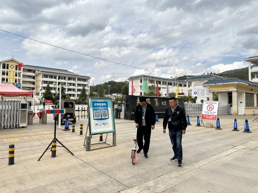 专卖执法人员测量中小学周边零售户距离(2023年6月19日摄)。杨卉珂洛 摄