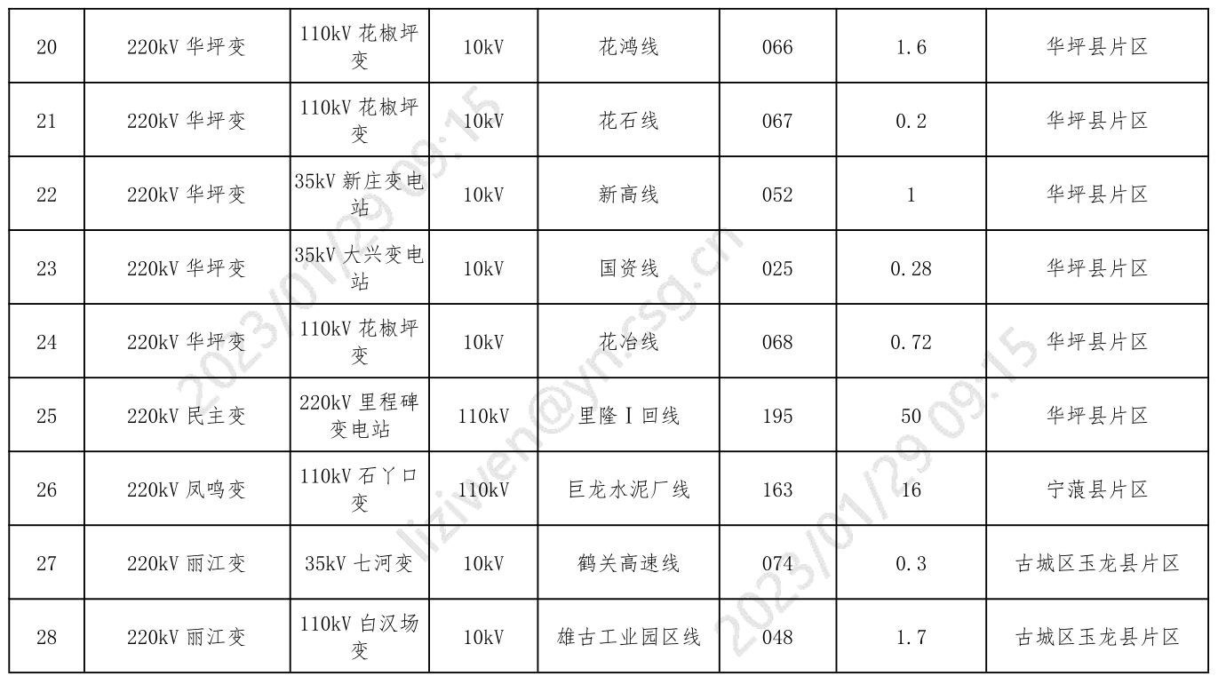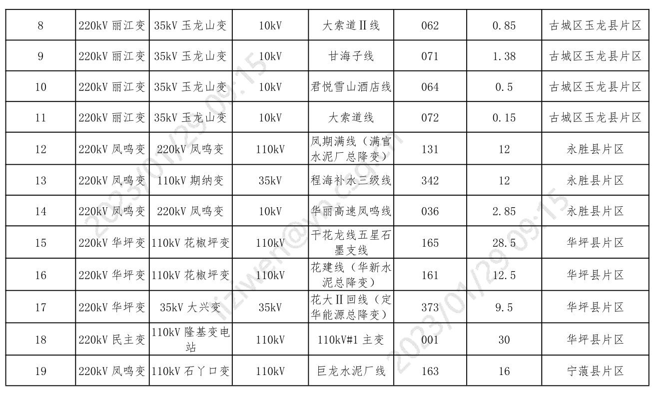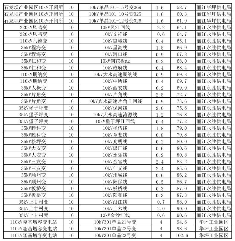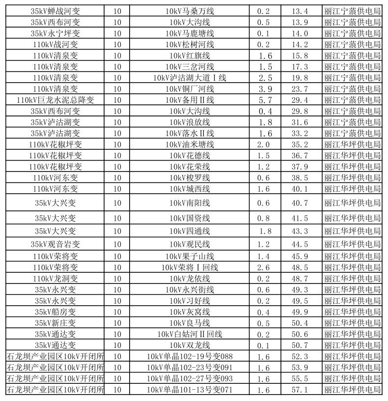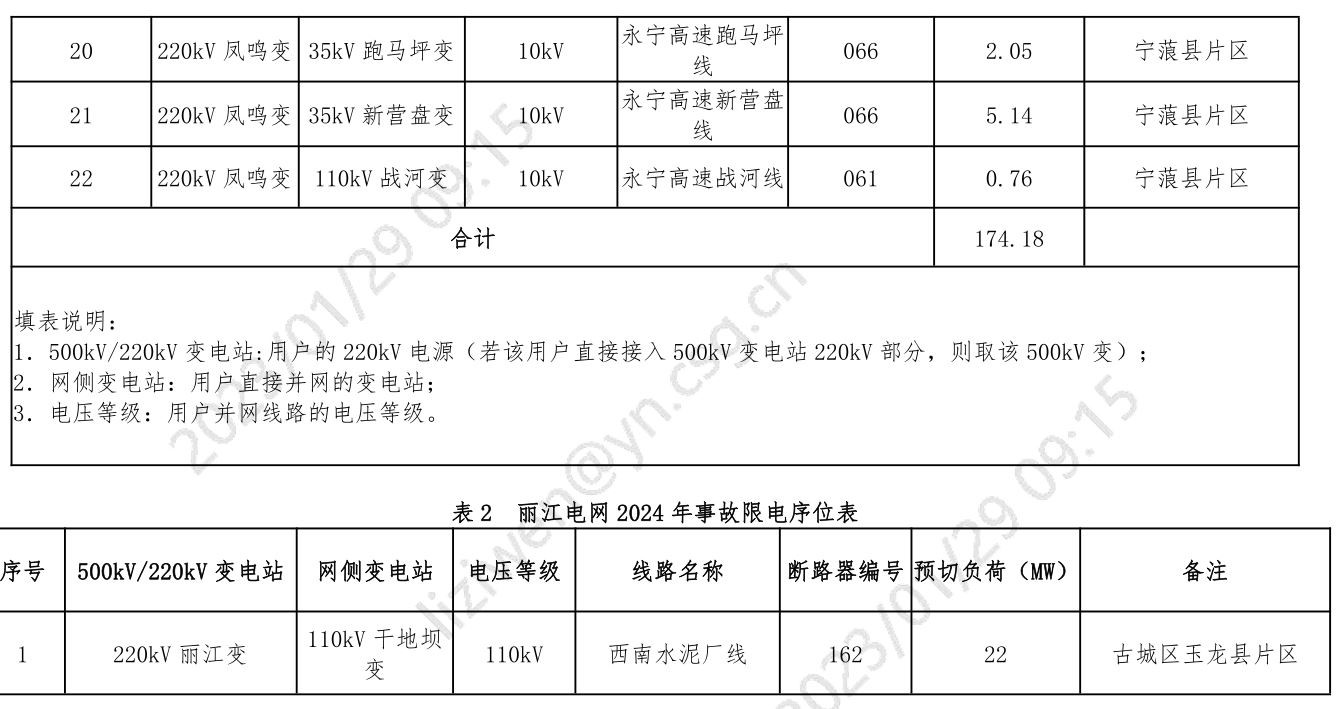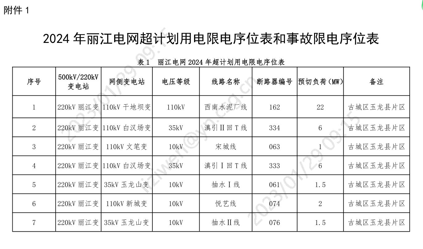 根据《电网调度管理条例》《电网调度管理条例实施办法》的有关规定和云南电网公司《关于开展 2024 年云南电网限电序位表和低频低压减负荷方案编制及实施工作的通知》(调度〔2024〕35号)要求,为确保丽江电网的安全稳定运行,更好地服务丽江经济社会发展,结合丽江电网实际情况,云南电网公司丽江供电局制定了《2024年丽江电网超计划用电限电序位表》《2024年丽江电网事故限电序位表》《2024年丽江电网低频低压减负荷方案》及《2024年丽江电网低频低压减负荷备用容量方案》,现将上述方案进行公示,公示期2024年2月21日-2024年2月23日,公示期间对方案有异议可联系丽江供电局电力调度控制中心,丁梦瑛,15012231807。