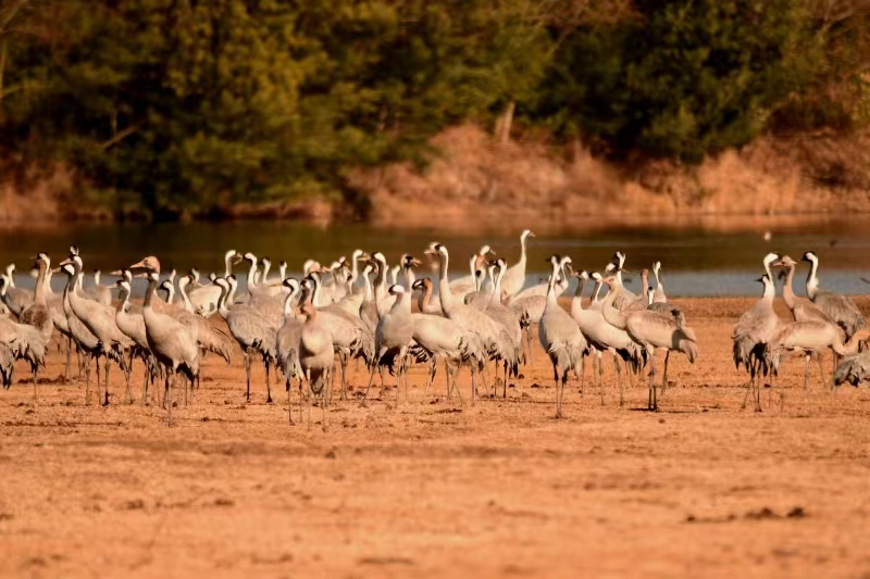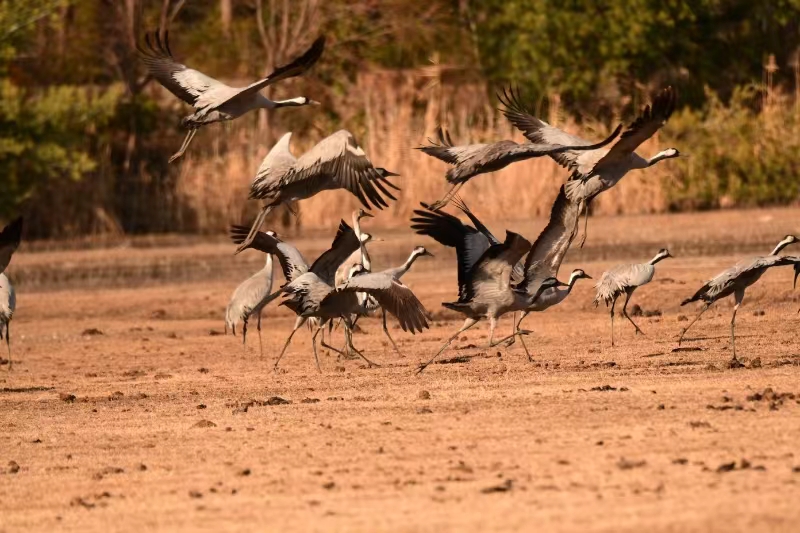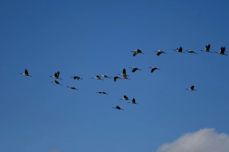 三五成群的灰鹤缓缓而归,从天而降,不一会儿,几只灰鹤排成队列,迎风起飞。这一队才飞走不久,又一支更大的队伍,已经列队完毕,蓄势待发。