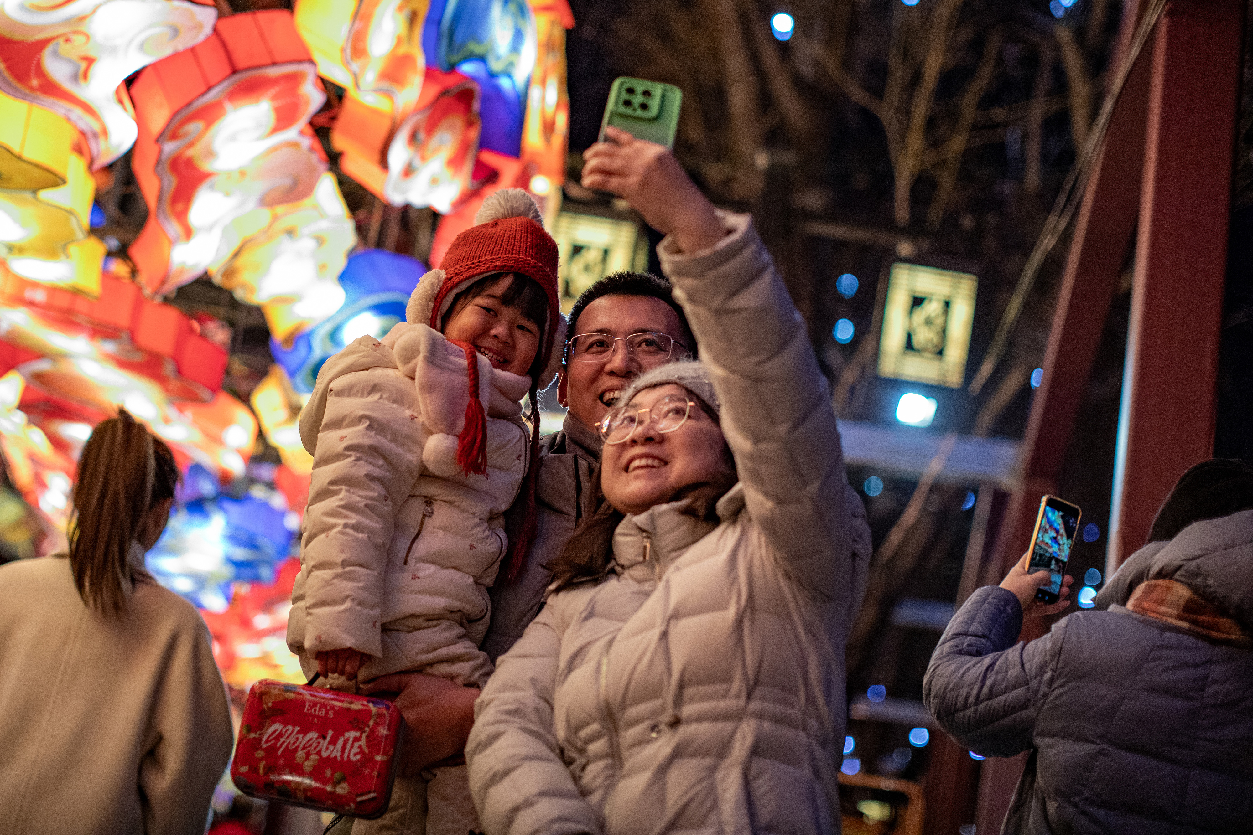 △ 2024年2月8日晚,北京,什刹海畔荷花市场上空,200余米的“蛟龙出海”巨型龙灯点亮,吸引市民打卡拍照。