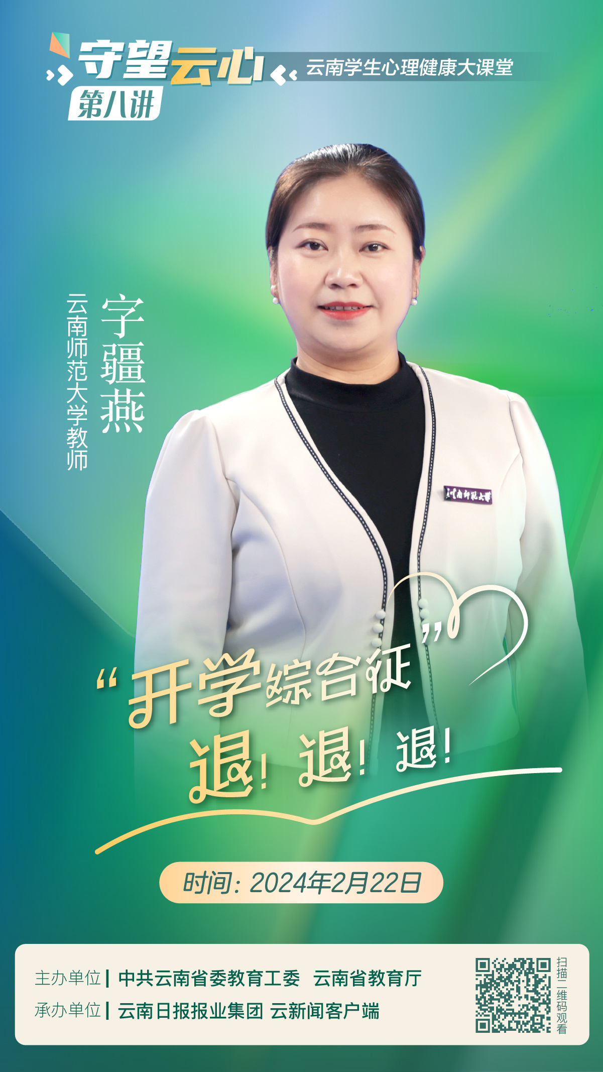 春节假期结束,新学期也即将开始!情绪低落、心慌意乱、浑身疲劳、注意力不集中、记忆力减退、失眠……每到新学期开学,都有同学因“开学焦虑”会出现不适应的问题,也就是所谓的“开学焦虑综合征”。那该如何快速找回状态,开启快乐新学期?“守望云心”云南学生心理健康大课堂第八讲即将上线,2月22日,由云南师范大学心理教师字疆燕和大家聊聊,如何摆脱“开学综合征”!