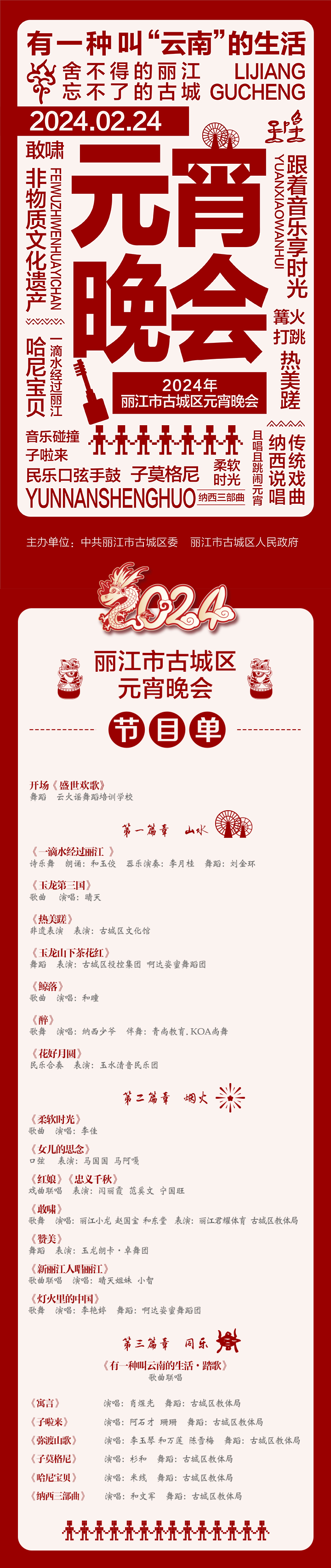 本次“舍不得的丽江 忘不了的古城”丽江棒棒会系列活动之“麒麟闹元宵”民俗展示和2024年丽江市古城区元宵晚会,将采用线下联欢、线上直播的方式进行。