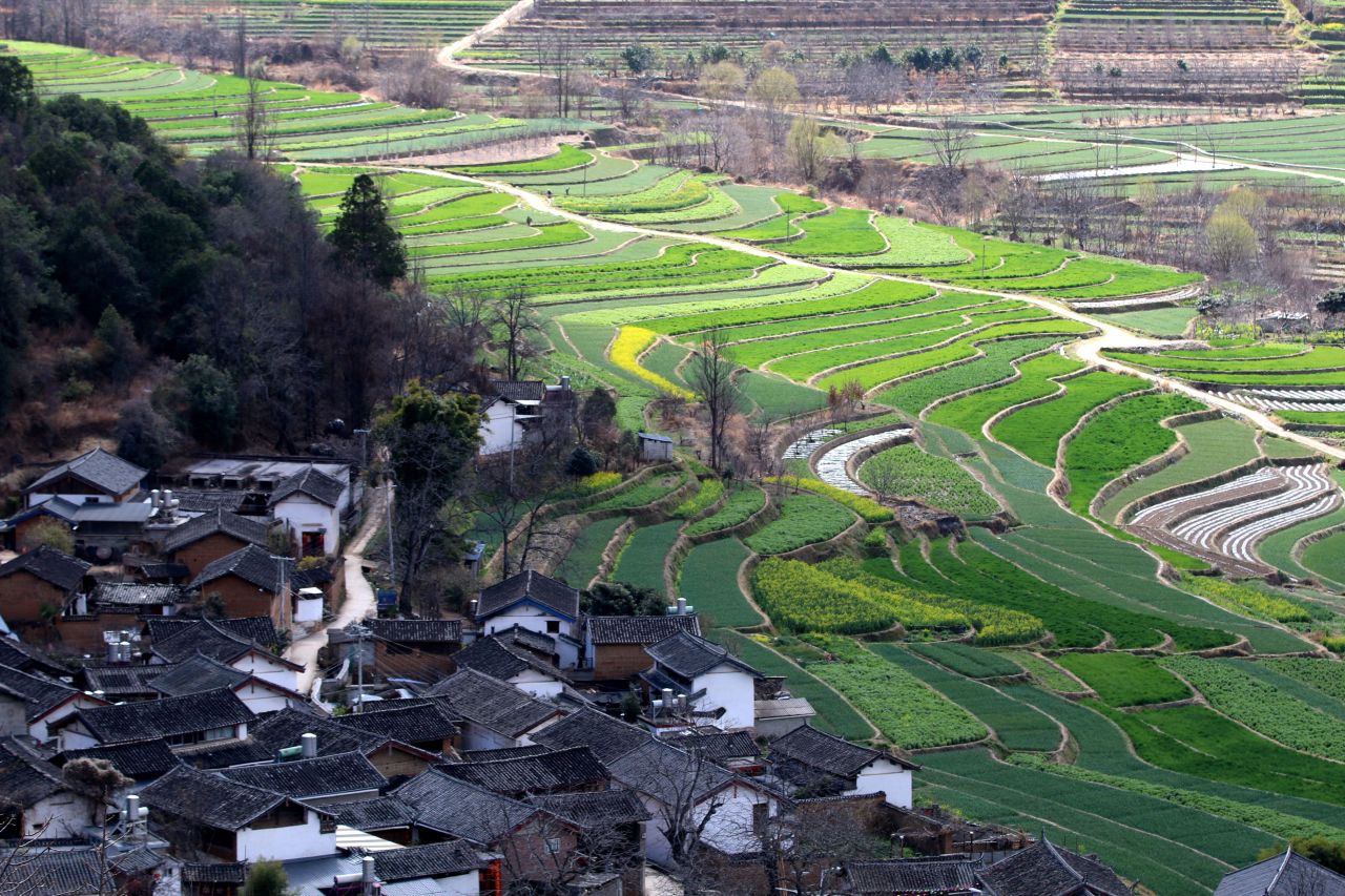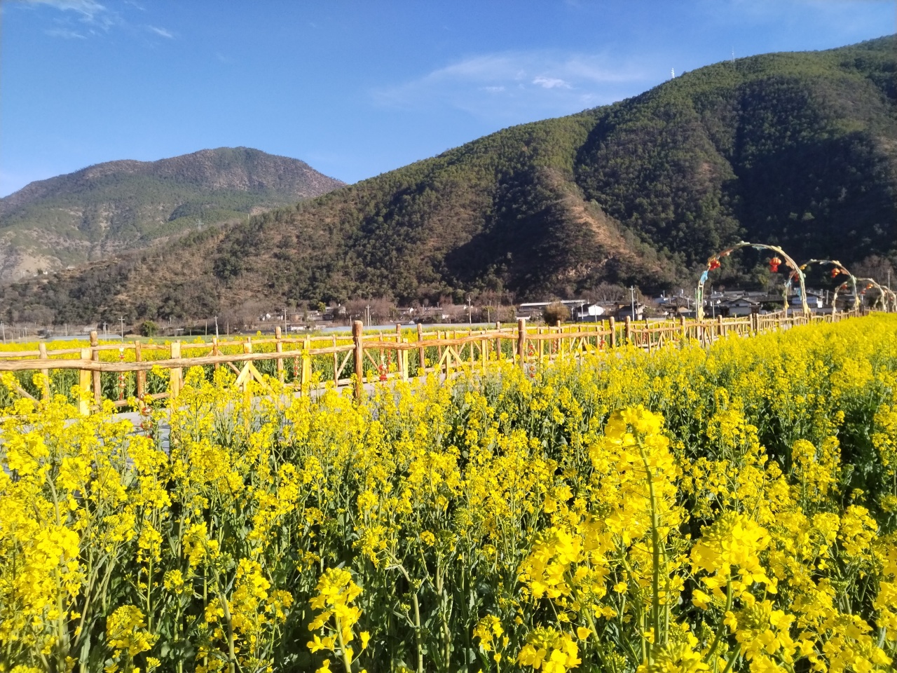 不同于罗平油菜花的漫山遍野,石鼓油菜花精巧秀美,不以磅礴壮观取胜,黄绿相间,镶嵌在块块绿色菜地、麦田之间,碧绿嫩绿翠绿墨翠,配合得恰到好处,与澄澈的天空,清澈流淌的江水,粉墙黛瓦的民居交相辉映,勾勒出一幅赏心悦目的田园春景图。