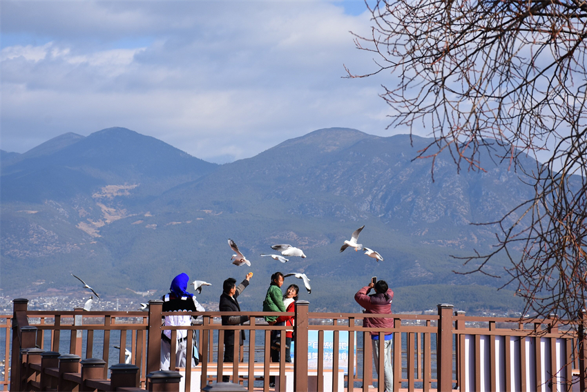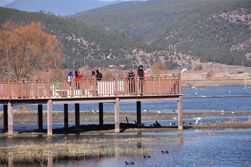 冬日清晨,玉龙纳西族自治县拉市镇拉市海高原湿地省级自然保护区内,数万只候鸟如“精灵”般浮在水面,时而觅食,时而休憩。湖边的观鸟长廊上,游客边走边用手机拍下候鸟们翩跹的舞姿。