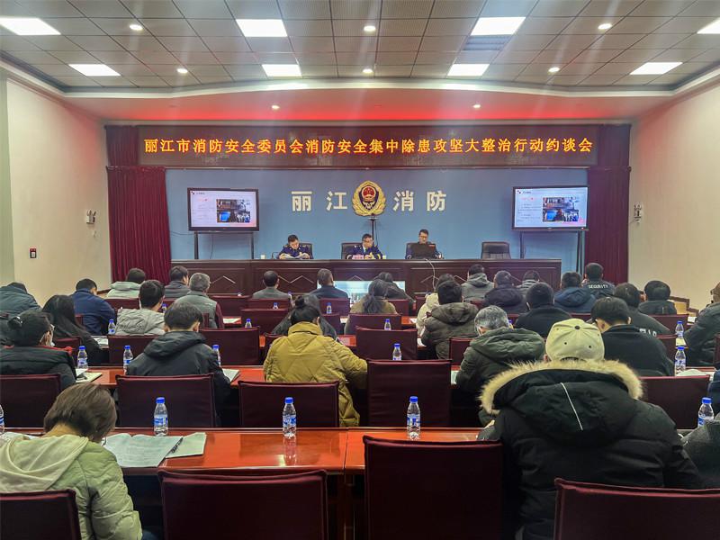 为认真贯彻落实习近平总书记重要指示精神,按照国家局、总队的部署要求,坚决彻底整治重点场所突出风险隐患,进一步推进消防安全集中除患攻坚大整治行动工作,切实提升全市火灾风险防御能力,确保社会面火灾防控形势稳定,2月23日,丽江市消防安全委员会组织召开消防安全集中除患攻坚大整治行动警示约谈会。全市56家成员单位分管领导、市重点企业责任人等相关人员参加会议。