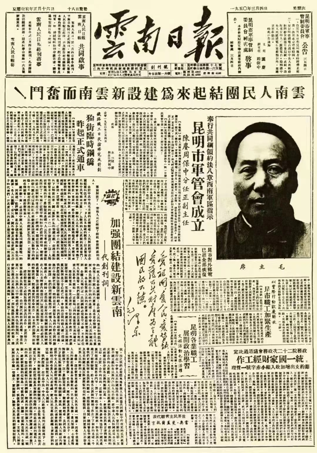 1950年3月4日,由毛泽东主席亲笔题写报头的云南省委机关报《云南日报》正式创刊。