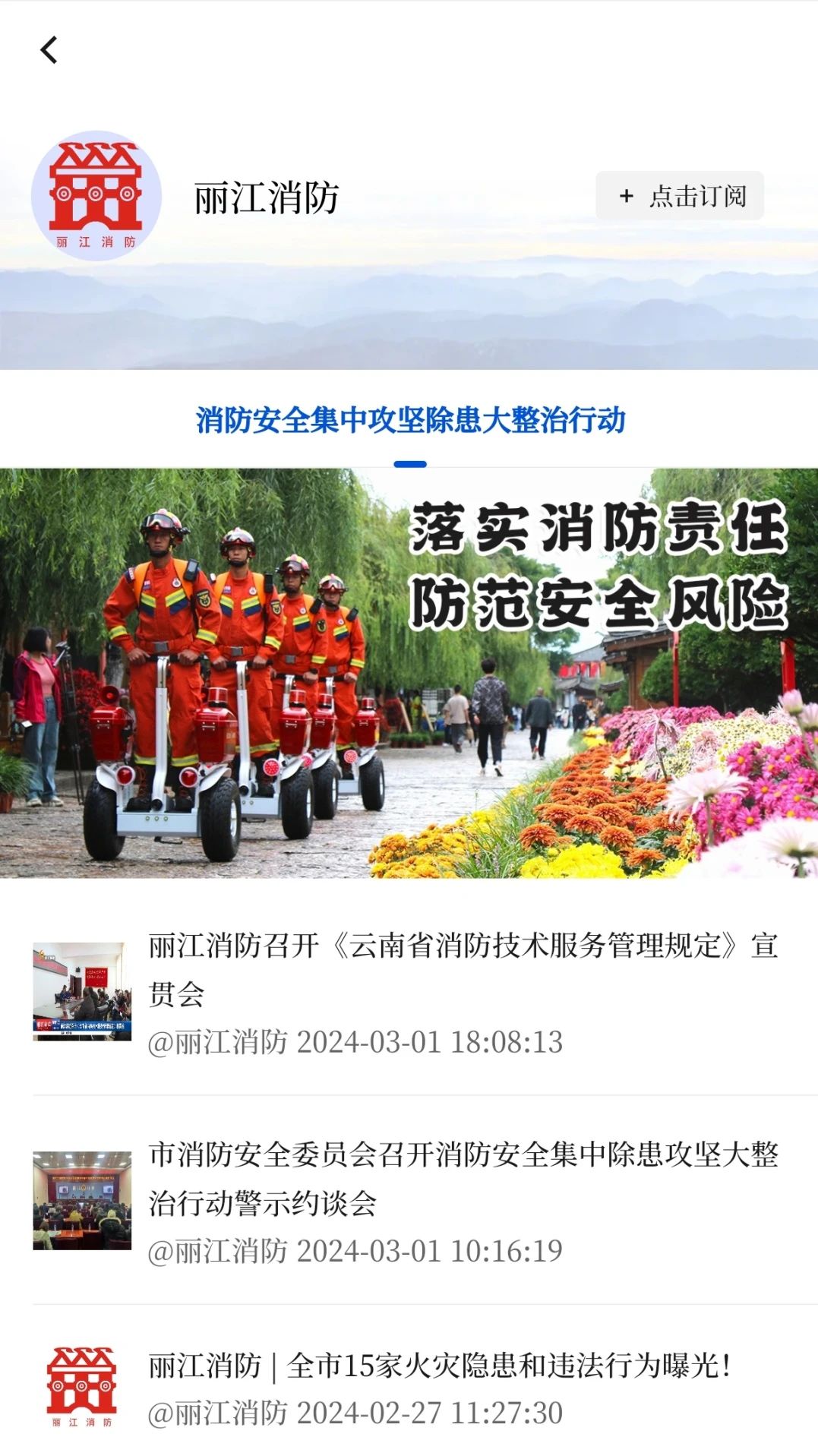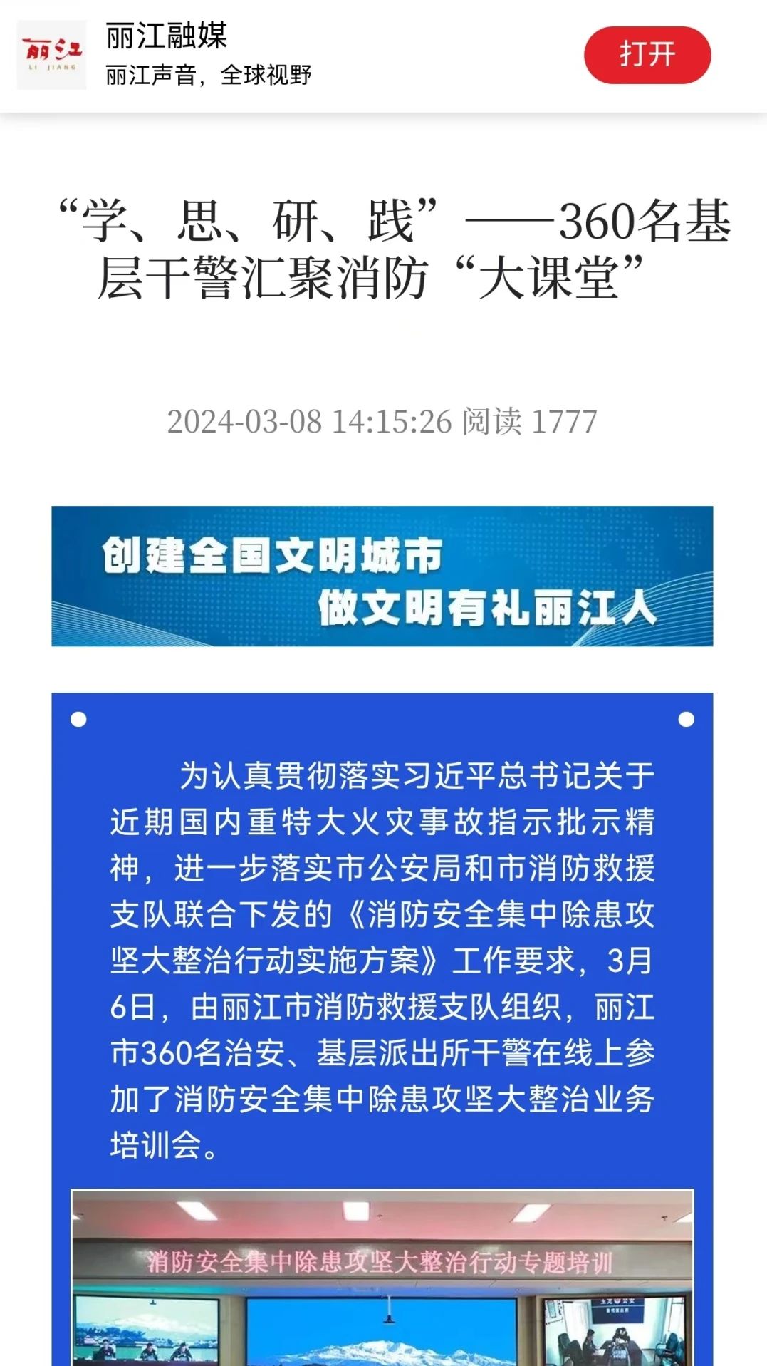 支队与丽江融媒开展合作机制,联合开设消防专栏1个,定时发布大整治行动动态新闻,共同制作消防安全公益广告1个。在丽江融媒、丽江读本、宁蒗新闻、今日永胜、玉龙之窗、美丽华坪等媒体平台推送各类除患攻坚大整治行动视频、稿件、提示等。