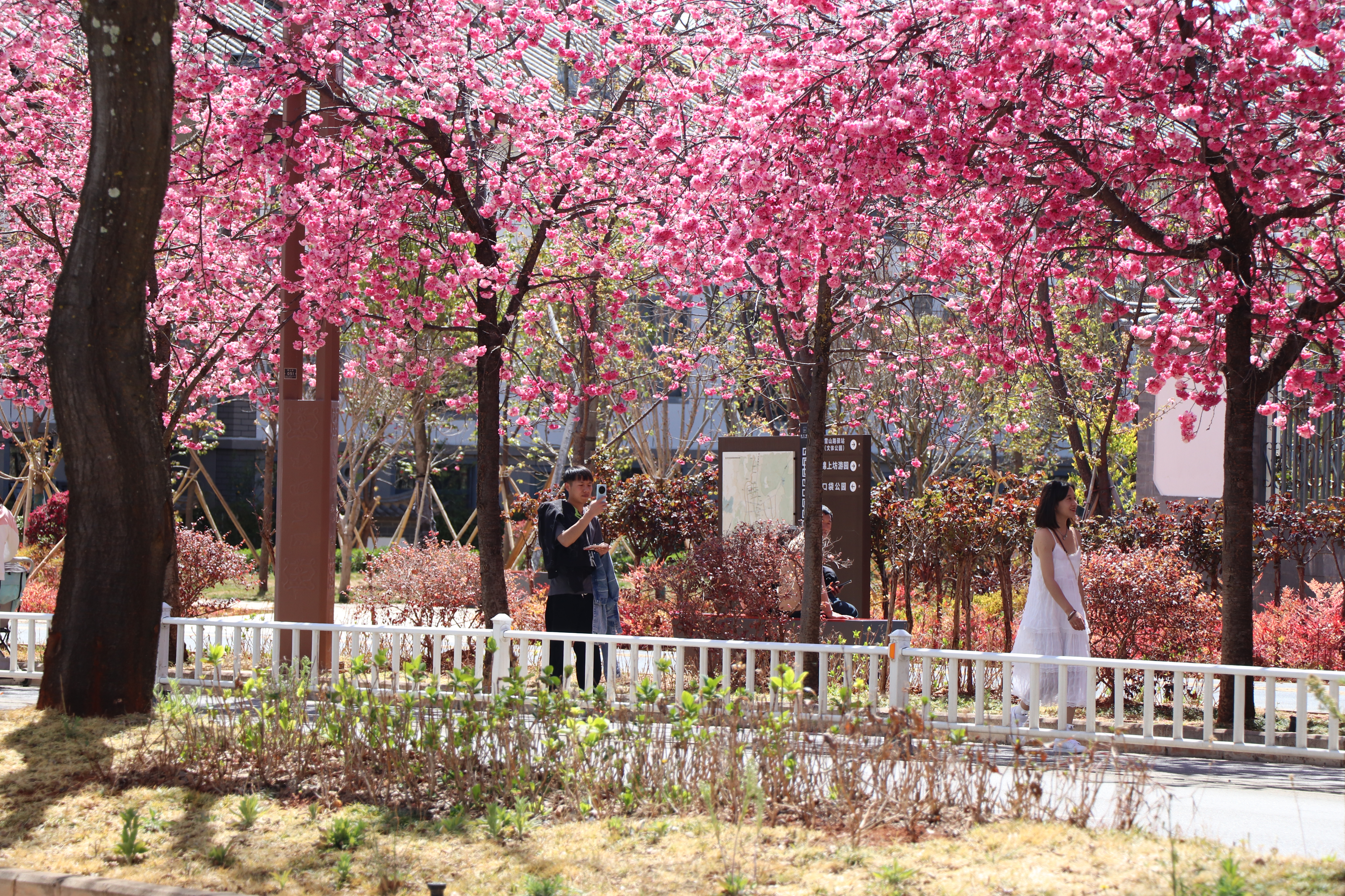 3月25日,丽江天气晴好,古城区雪山路的樱花开得更加绚烂艳丽,市民在樱花树下赏花拍照,感受春天的美好。(本报记者 和丽辉 摄)(责编:和丽辉)