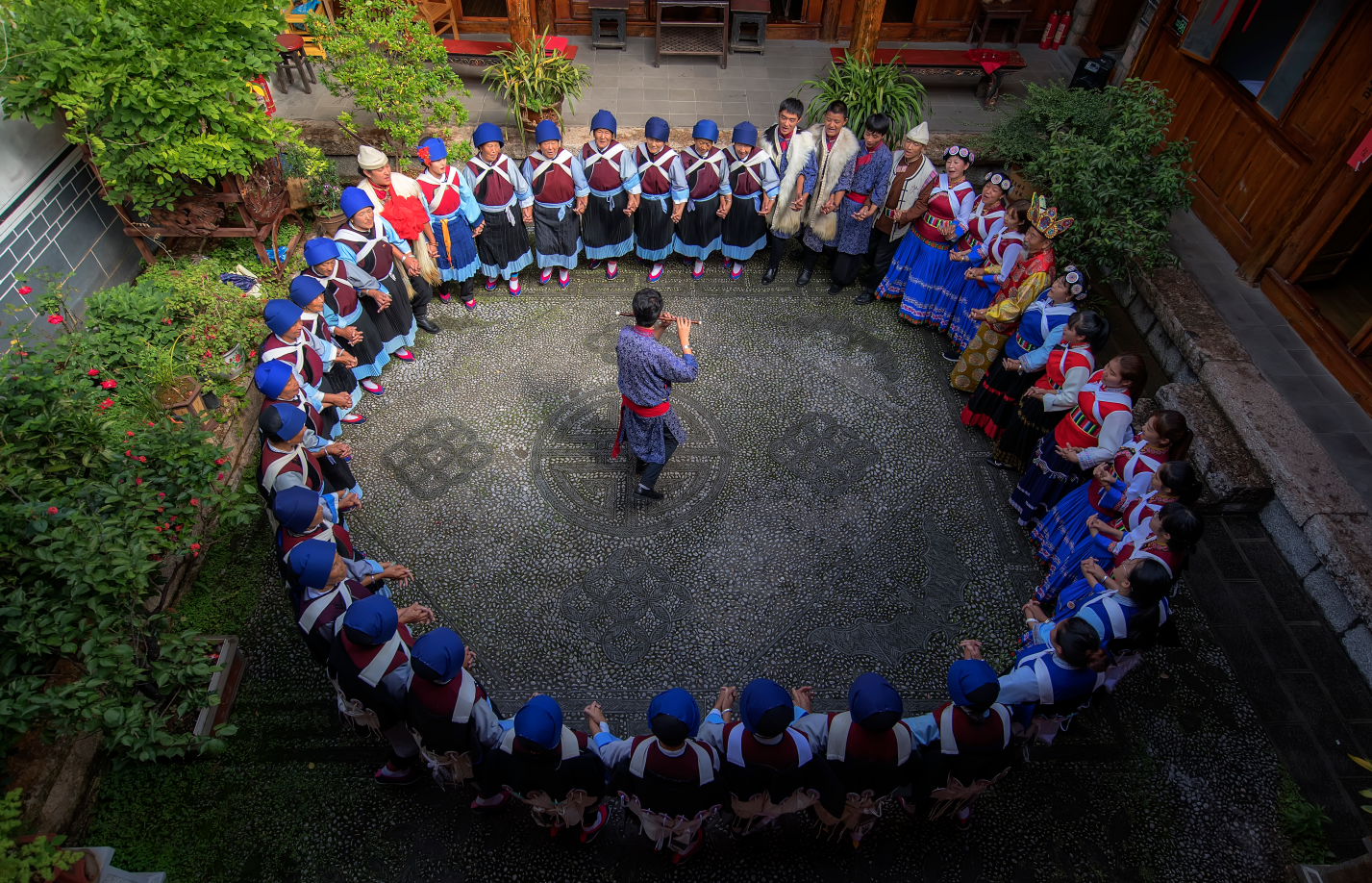 大研古镇里“纳西人家”纳西婚俗文化院落打跳。王毅 摄