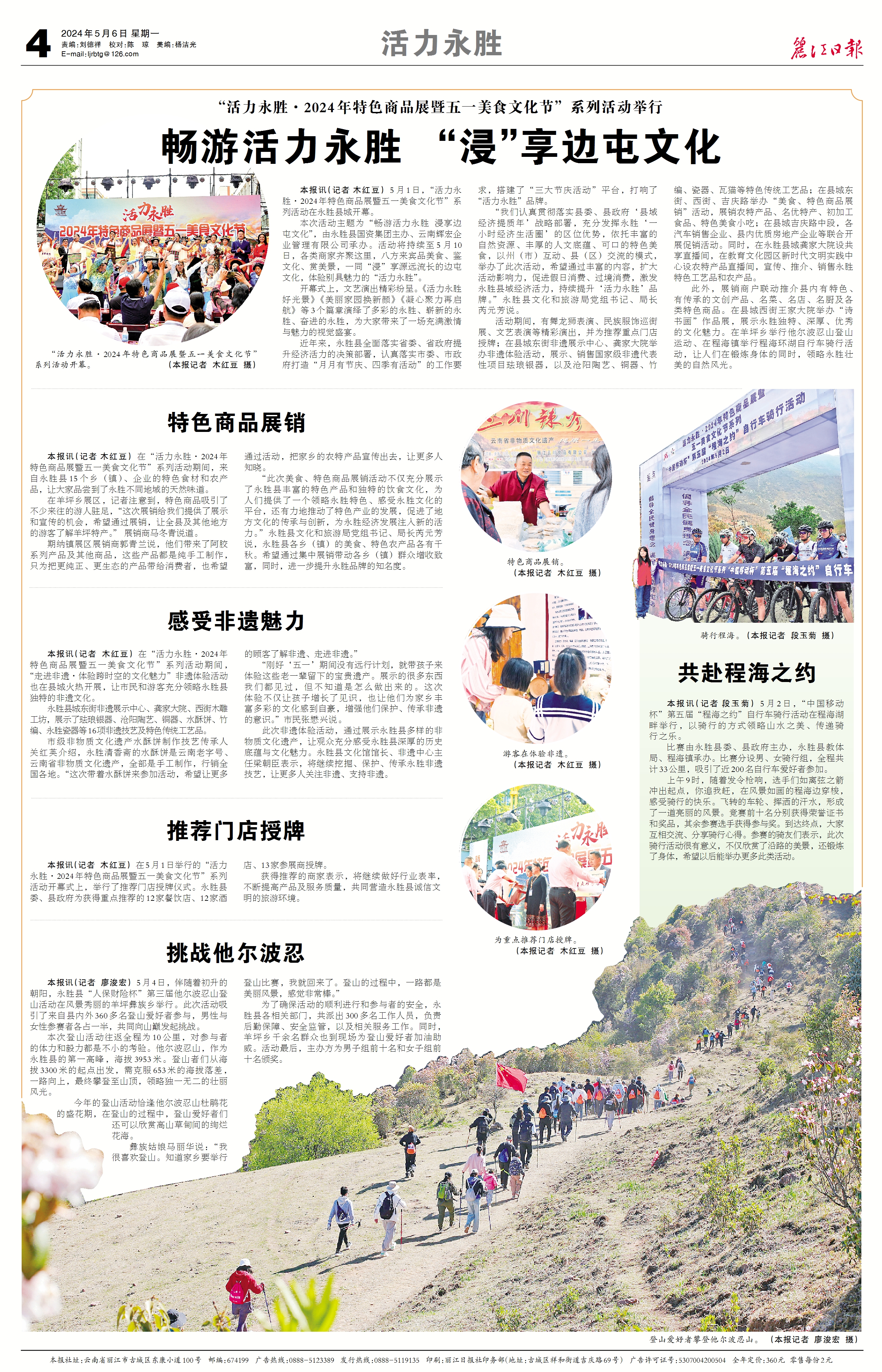 此外,展销商户联动推介县内有特色、 有传承的文创产品、名菜、名店、名厨及各 类特色商品。在县城西街王家大院举办“诗 书画”作品展,展示永胜独特、深厚、优秀 的文化魅力。在羊坪乡举行他尔波忍山登山 运动、在程海镇举行程海环湖自行车骑行活 动,让人们在锻炼身体的同时,领略永胜壮 美的自然风光。