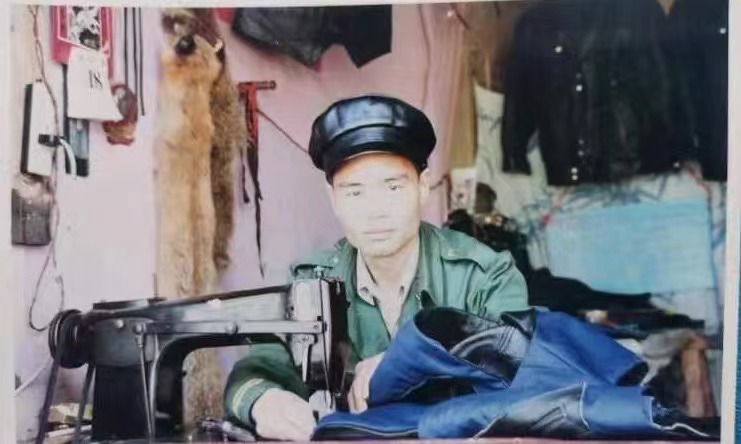 年轻时候杨宏举在皮革店内制作皮衣。(供图)