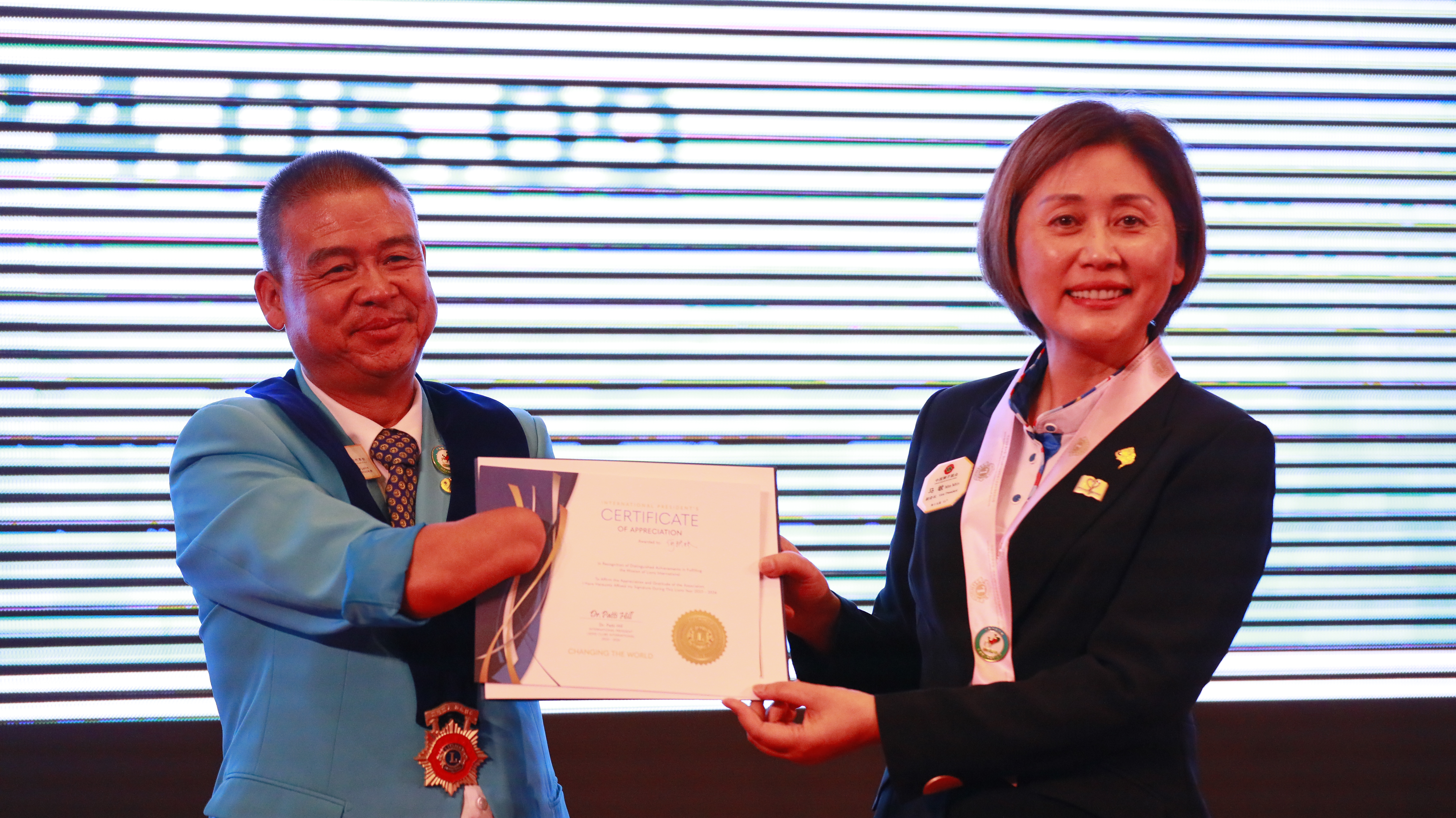 中国狮子联会副会长马敏为丽江三朵雪山服务队授证、授队旗、授槌、授带;新会员佩戴徽章后,宣誓入会承诺。