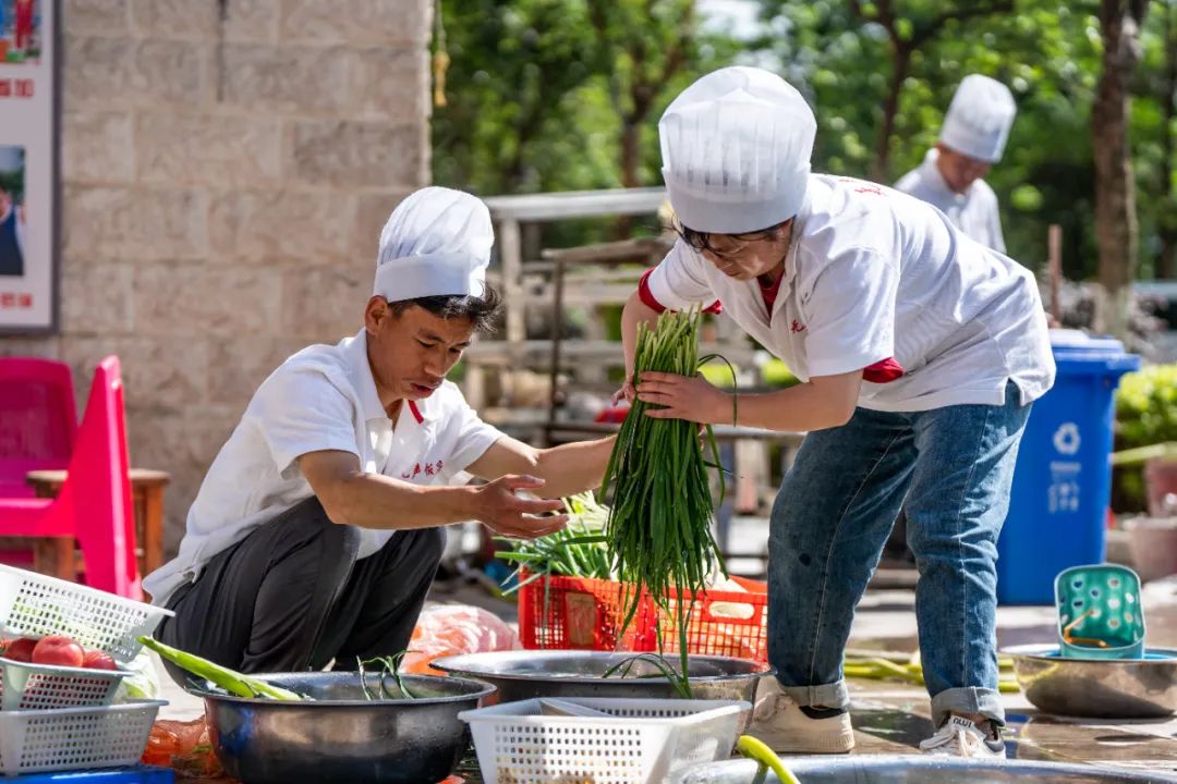 大家洗菜、择菜、穿串