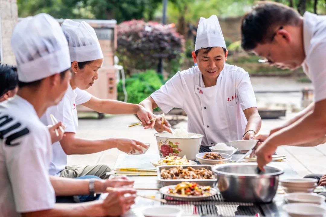 饭店所有人围坐一桌吃饭
