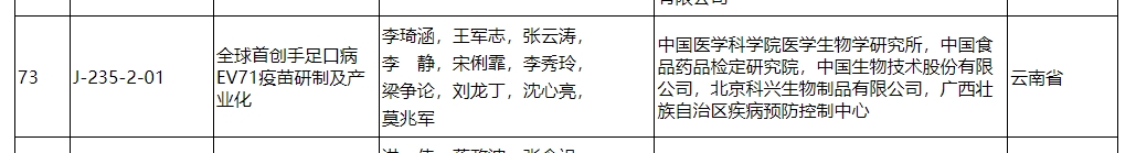 该项目由中国医学科学院医学生物学研究所主持完成,攻克了系列理论及技术难点,实现了全球首创的EV71疫苗上市及应用,有效控制了我国EV71疫情。