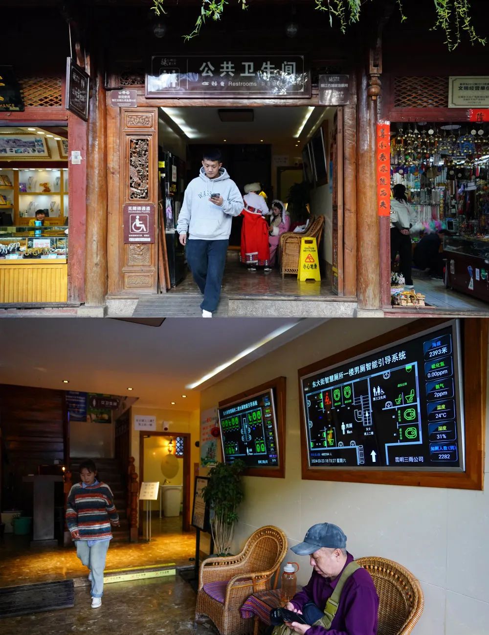 上图为在丽江古城内拍摄的智慧厕所外景;下图为智慧厕所内的智能引导系统大屏。新华社记者 陈欣波 摄