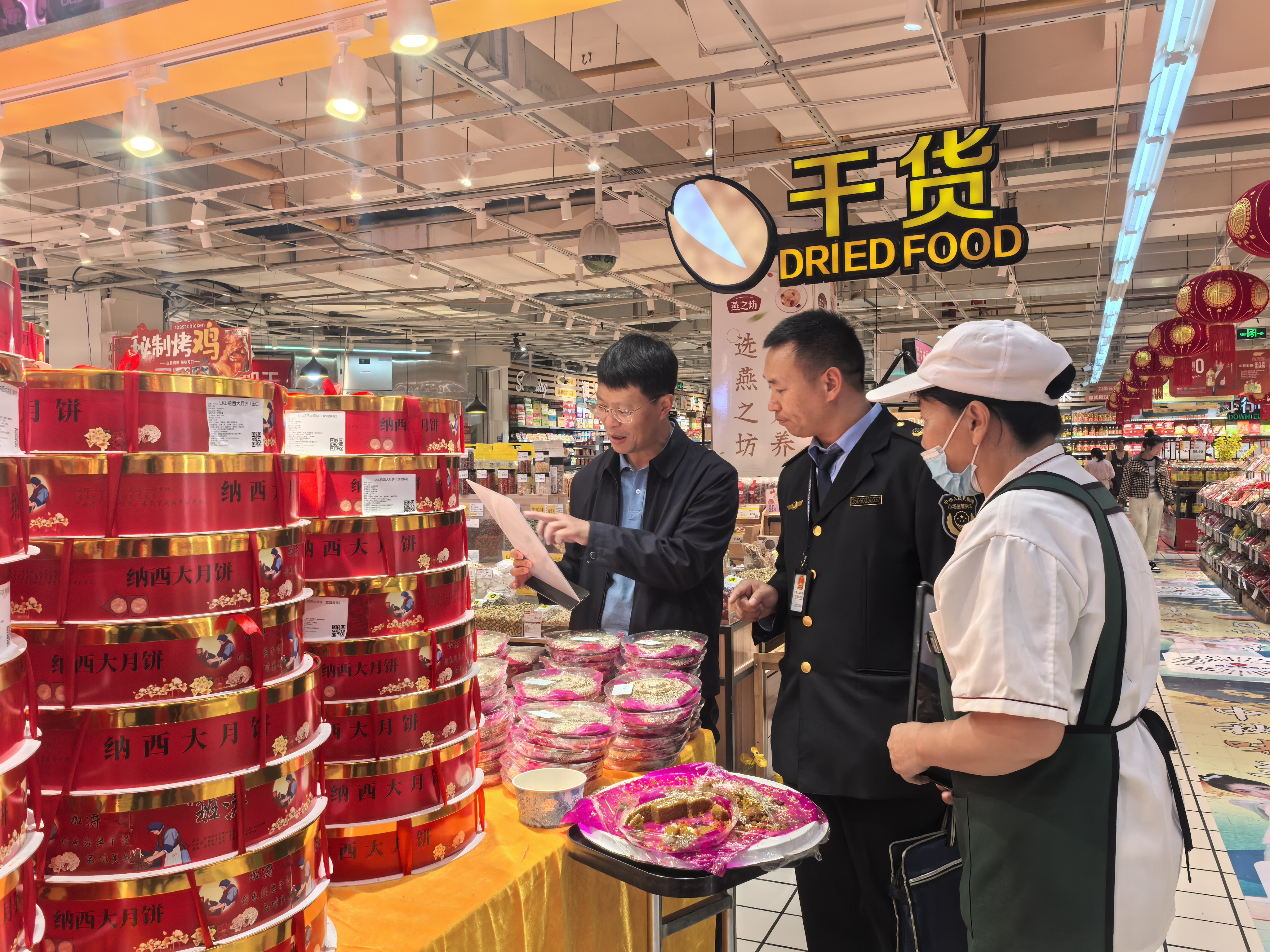 在超市内,市政府食品安全委员会办公室和市市场监管局检查人员共同对货架上的月饼进行检查,并交代工作人员要检查好生产日期,做好柜面清洁等工作。