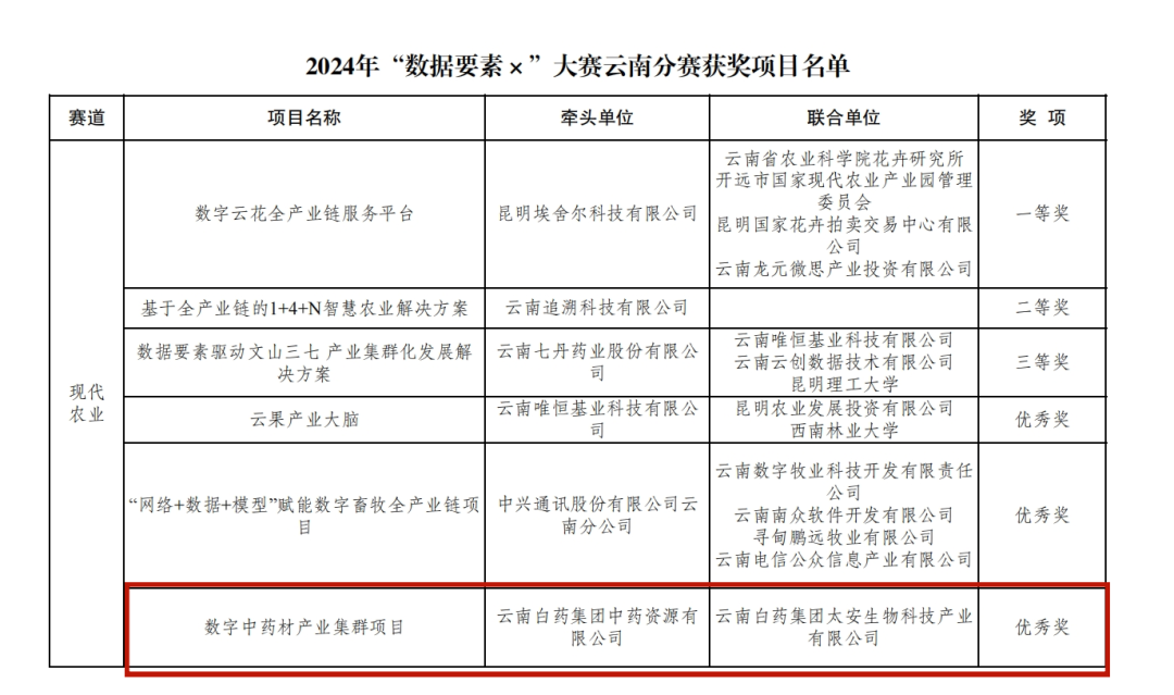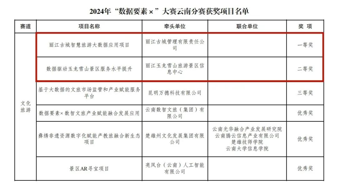 经过初赛评审、技术验证、决赛评审、专家会议、公示等环节,由丽江古城管理有限责任公司选送的“丽江古城智慧旅游大数据应用项目”荣获文旅赛道一等奖;由丽江玉龙雪山旅游景区信息中心选送的“数据驱动玉龙雪山景区服务水平提升项目”获文旅赛道二等奖。在现代农业赛道方面,由云南白药集团中药资源有限公司牵头,并联合云南白药集团太安生物科技产业有限公司选送的“数字中药材产业集群项目”荣获优秀奖。据了解,每个赛道前两名,由云南省数据局择优推送大赛组委会,大赛组委会经审核后纳入全国总决赛。