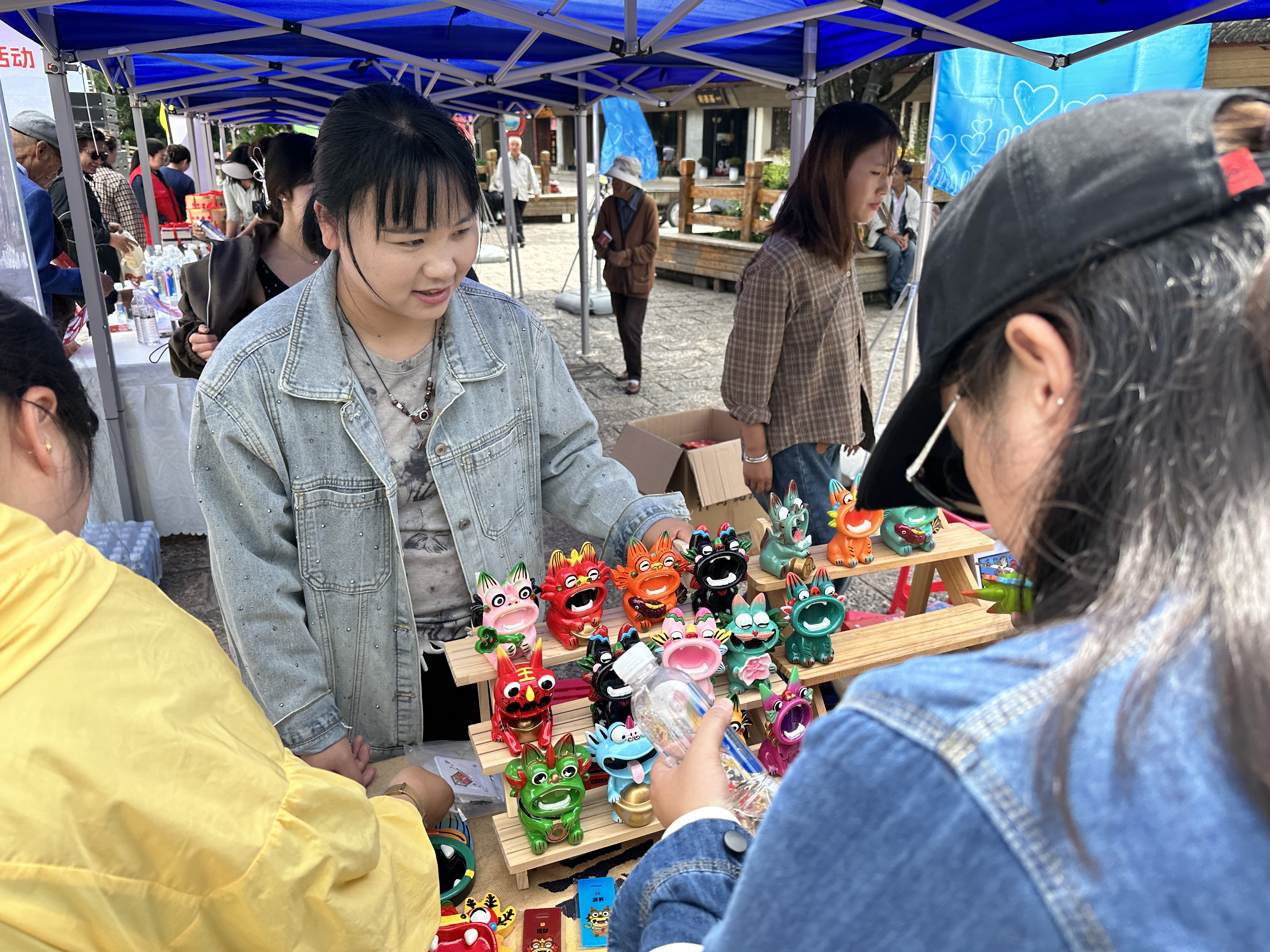9月14日,在玉河广场,古城区阳光社会组织服务中心进行义卖的困难群众亲手制作的手工艺品。(罗蓉 摄)