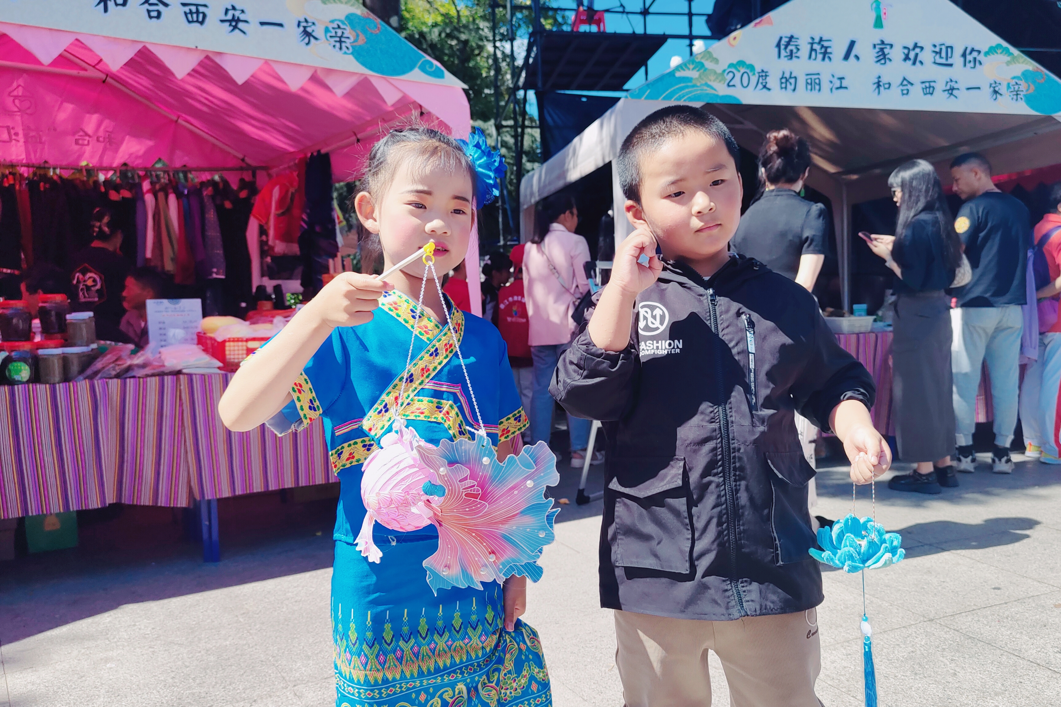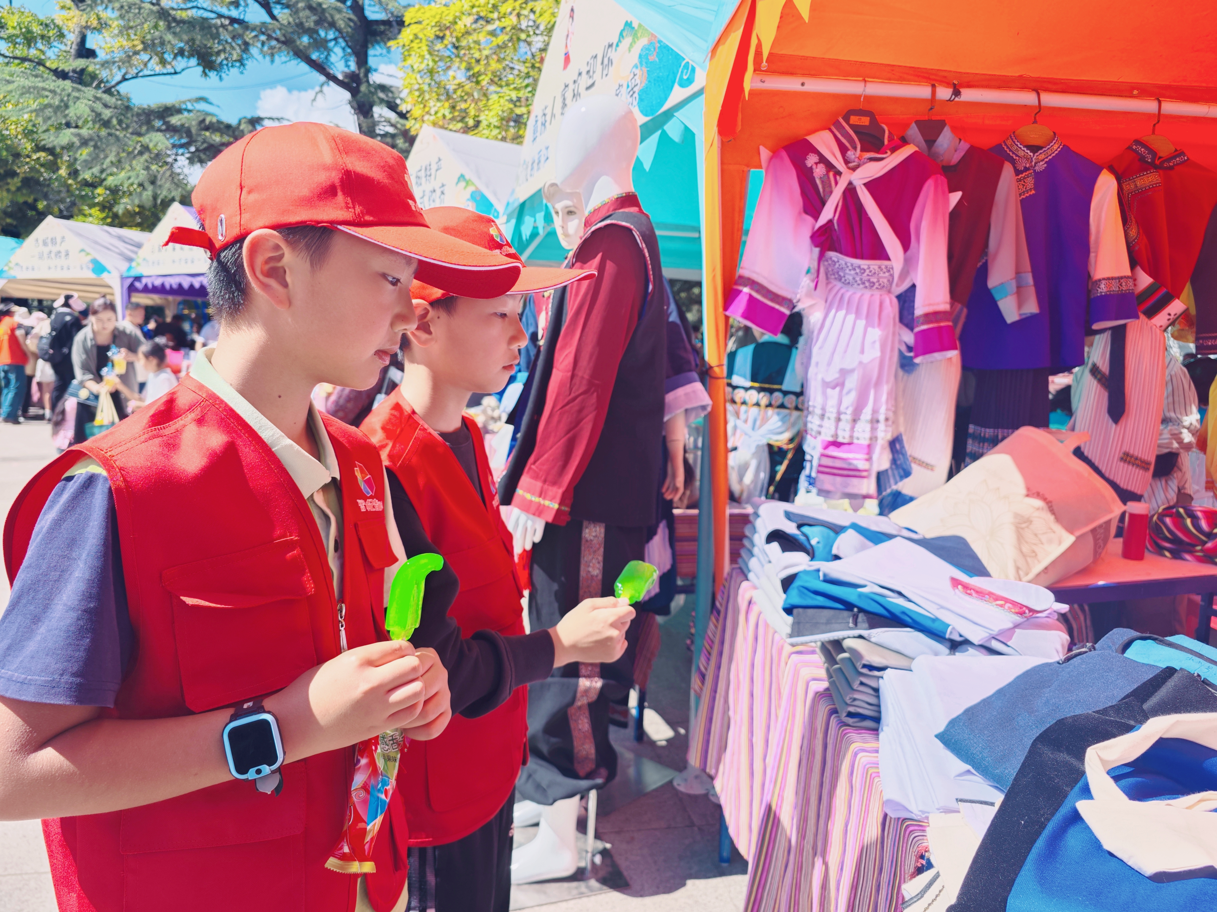 在此次“行走的思政课”现场,有很多代表着不同民族的美食民俗展位,如汉族水酥饼、纳西族米灌肠、回族牛干巴、藏族酥油茶、傣族泡鲁达等,每个展位前的叔叔阿姨哥哥姐姐们,也都穿着本民族的服装。融媒小记者们不仅吃到了心仪的美食,还能零距离接触到了不同民族的文化与习俗。