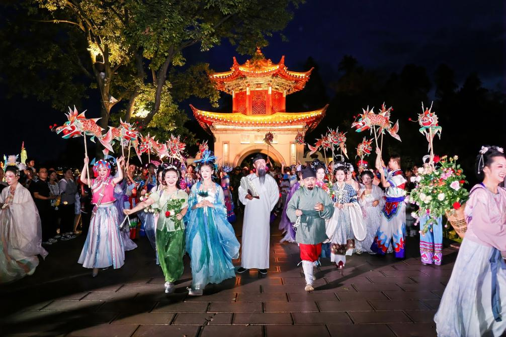漫步于“云津夜市”,仿佛穿越时空,回到了古代的繁华市集。汉服小贩穿梭其间,古筝琵琶之音绕梁不绝,传统乐韵与现代光影共舞,营造出一幅生动的国风画卷。游客们随工作人员穿梭于市集,参与剧本游园、集章打卡,享受一场深度文化沉浸之旅。