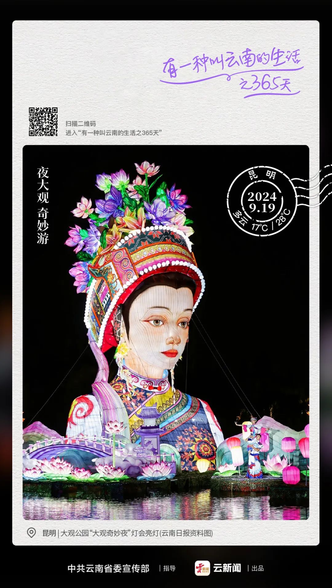 夜幕降临,64组彩灯如星河璀璨,巨型灯组“阿诗玛”与“大观印象”“滇派内画”等彩灯交相辉映,将非遗之魂以光影语言娓娓道来,让游人尽览云南文化的深邃与绚烂。