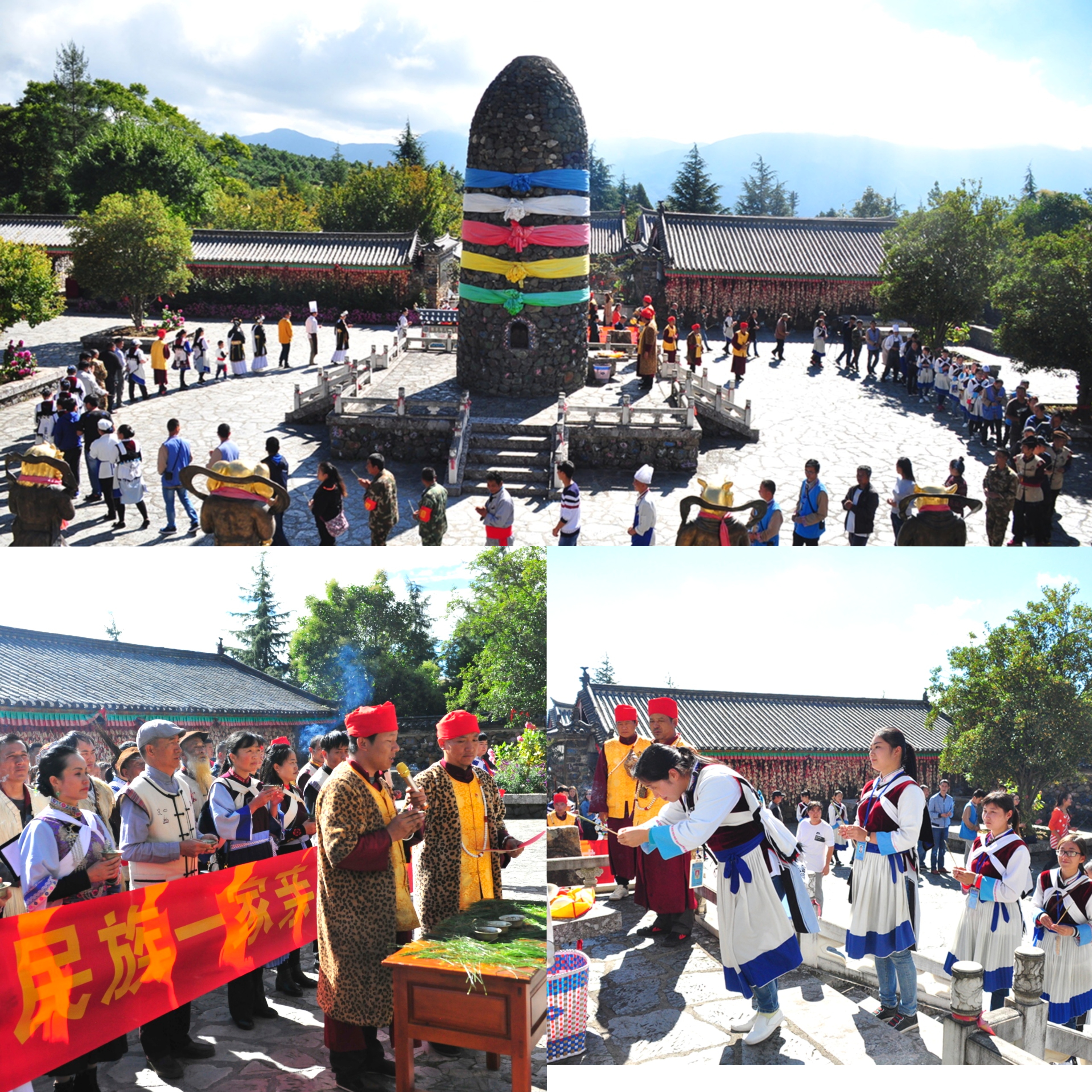 玉水寨景区每年国庆节都会举行庆国庆东巴祈福仪式,每年10月1日上午10点,公司全体员工都会到景区和合院里,在天香炉前参加庆国庆祈福仪式,在现场的游客也会受邀加入其中,届时在场的所有人员会在东巴带领下,在10点整时一起奏唱《国歌》,之后东巴会击7次万福铃,每次寓意10年,敲5次吉祥鼓,每次寓意一年,然后大家在东巴的带领下为祖国祈福,最后还会一起歌唱《我和我的祖国》,仪式感很强,希望通过这样的活动表达对祖国的祝福,祝愿祖国繁荣昌盛,国泰民安。
