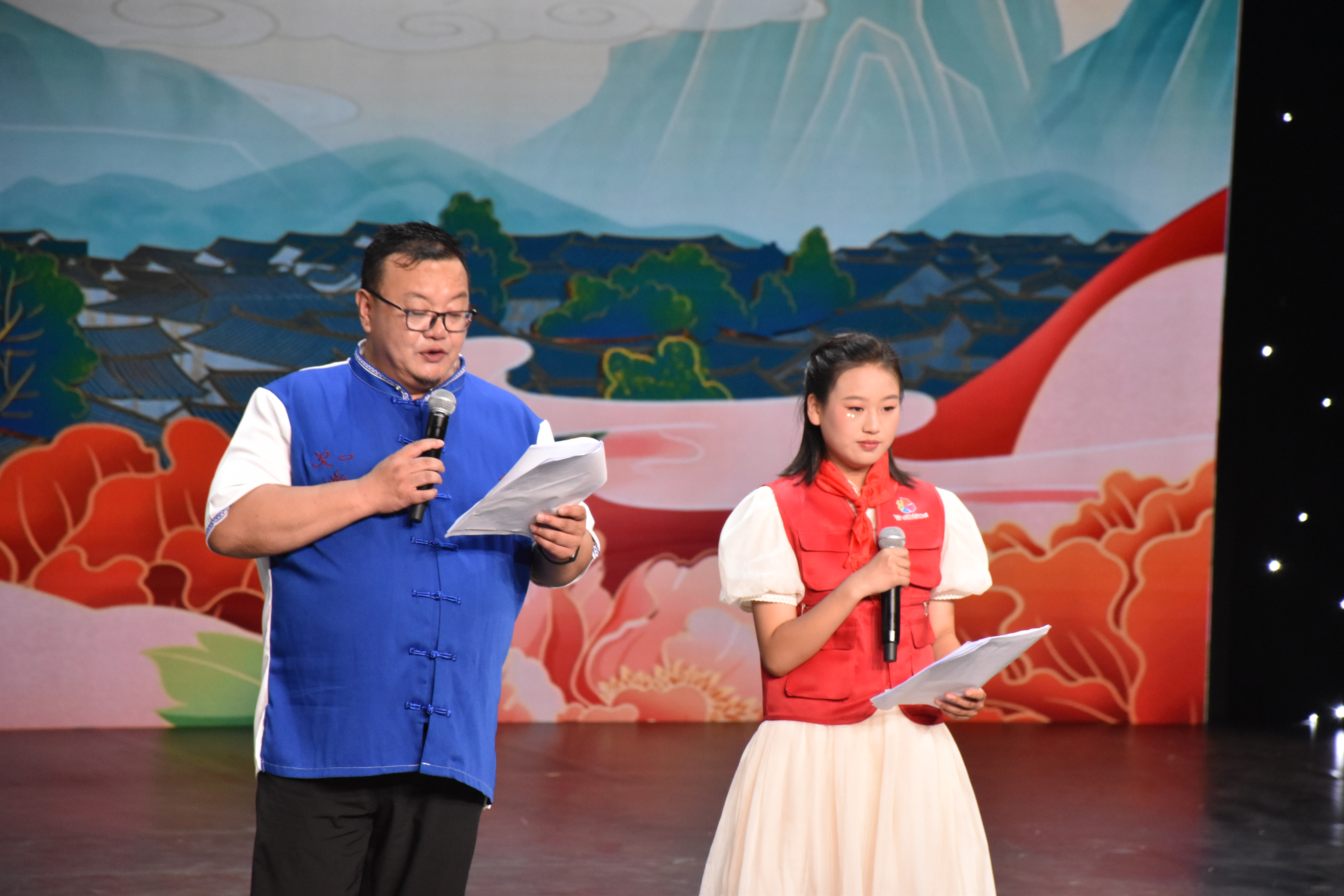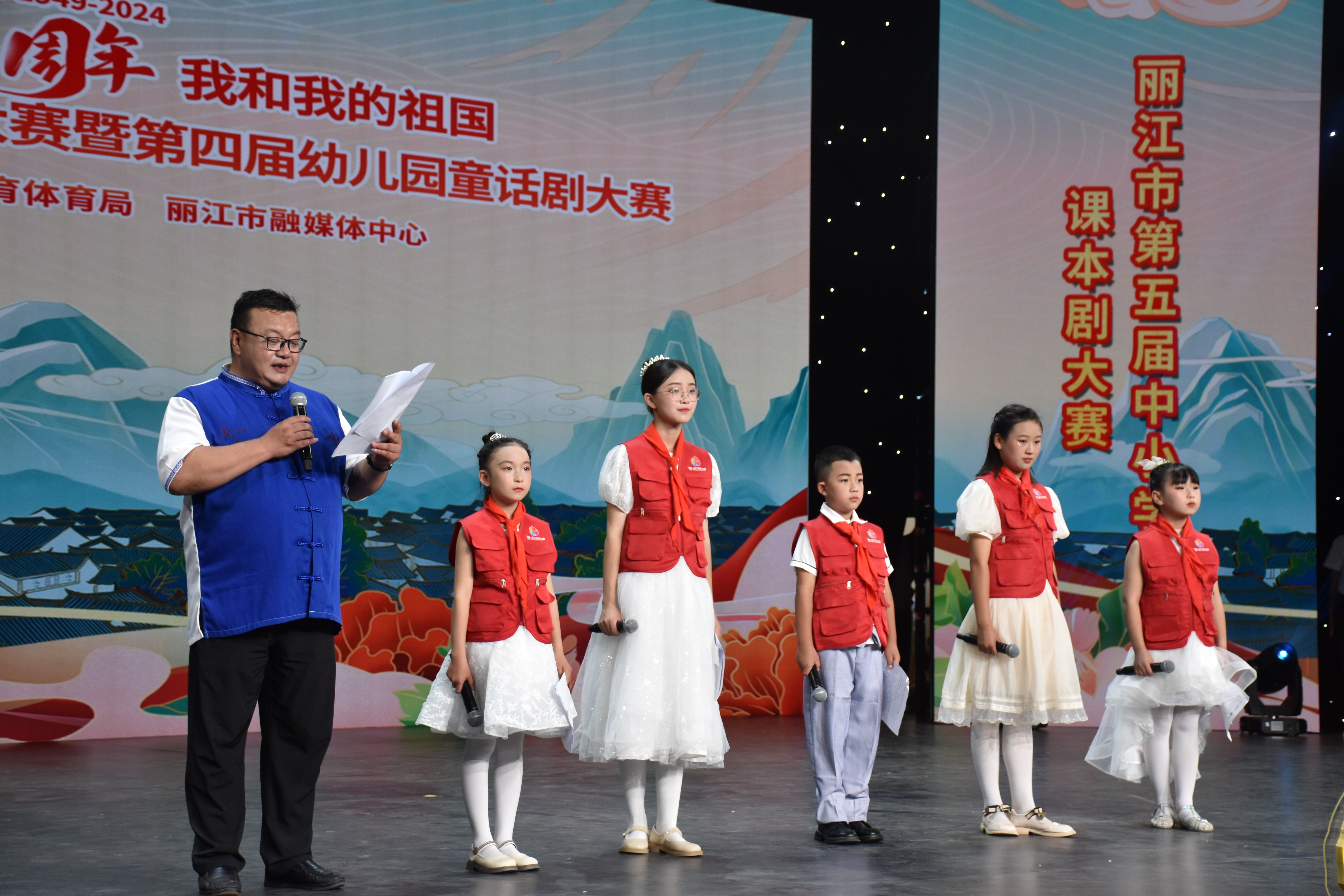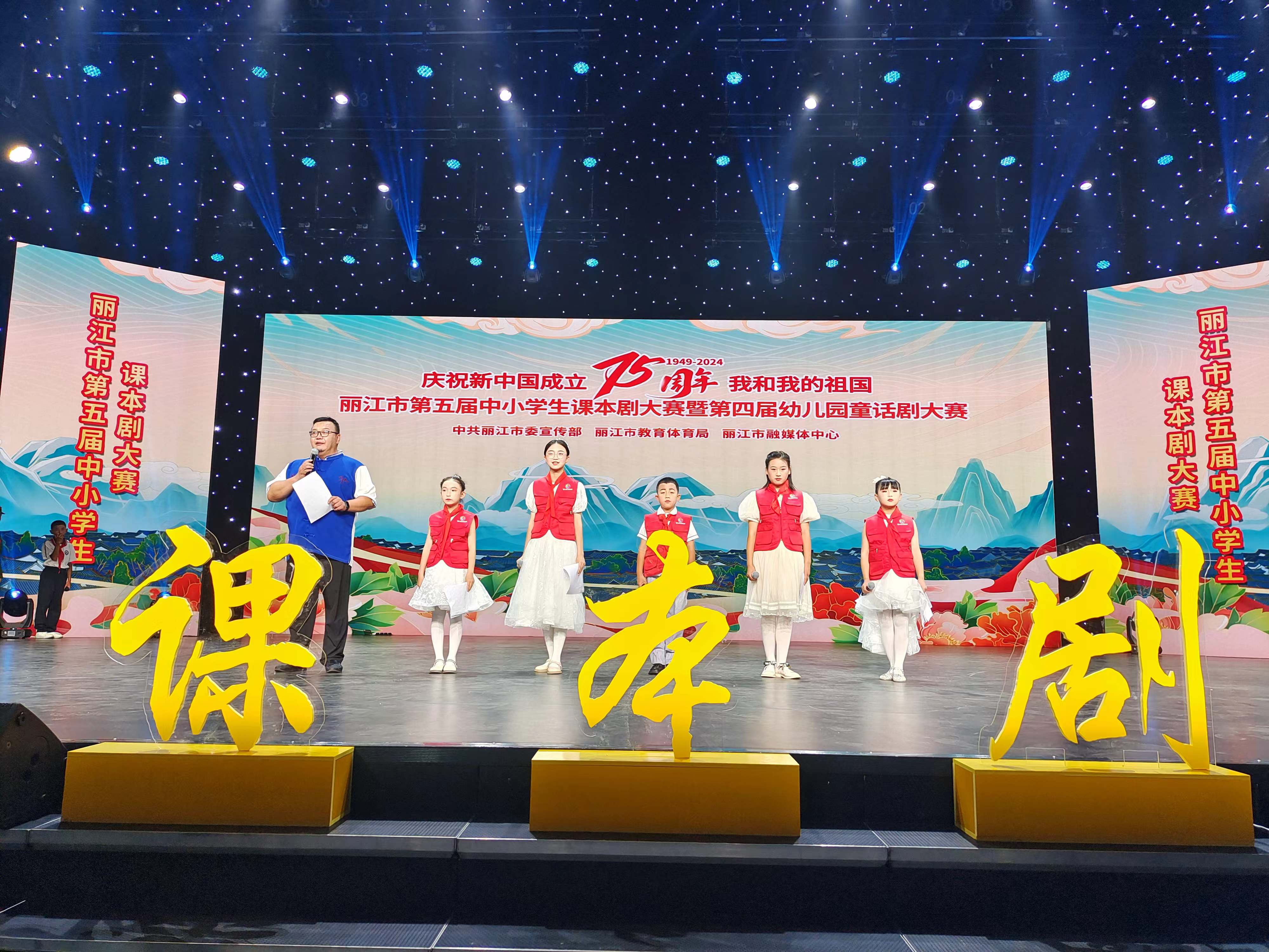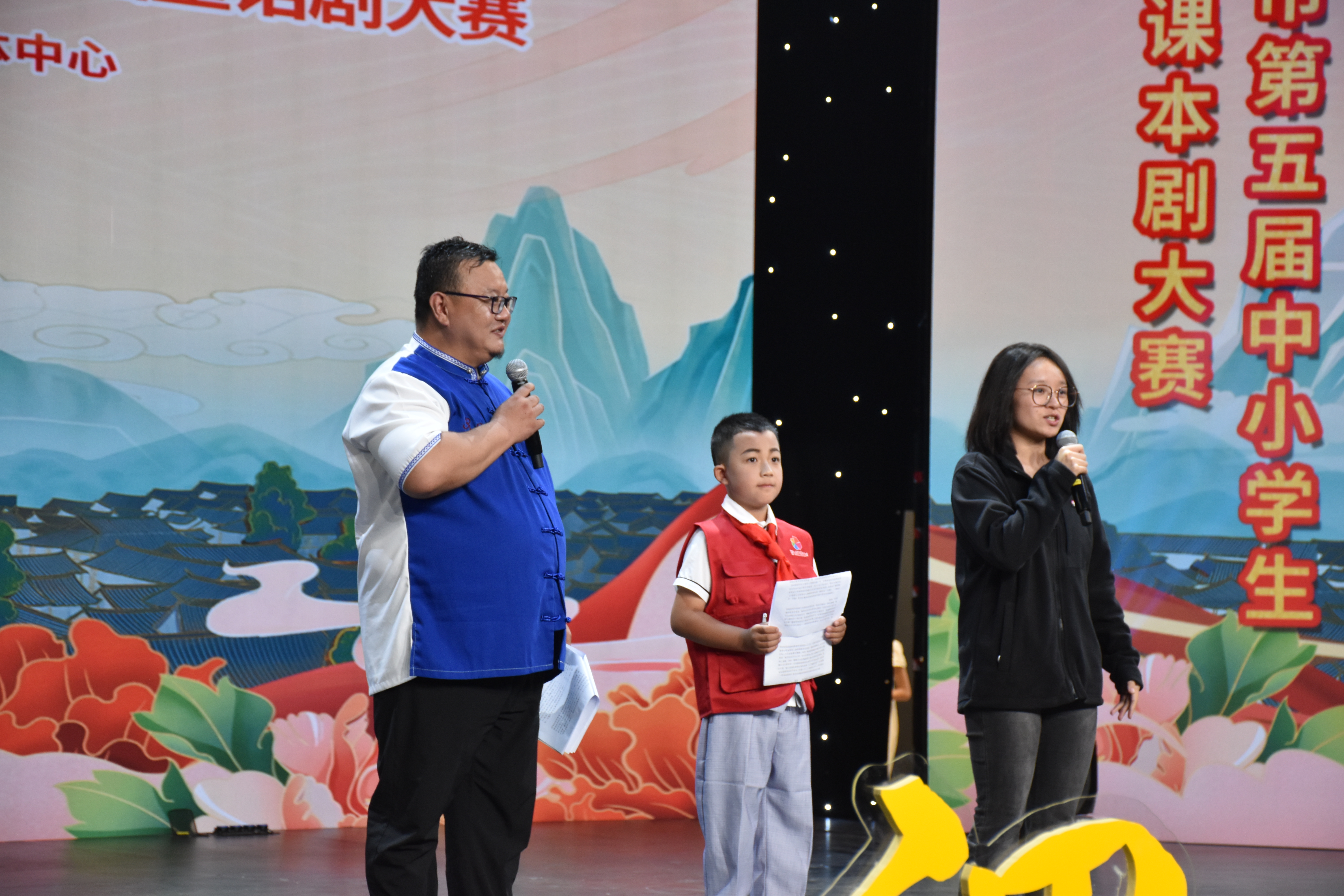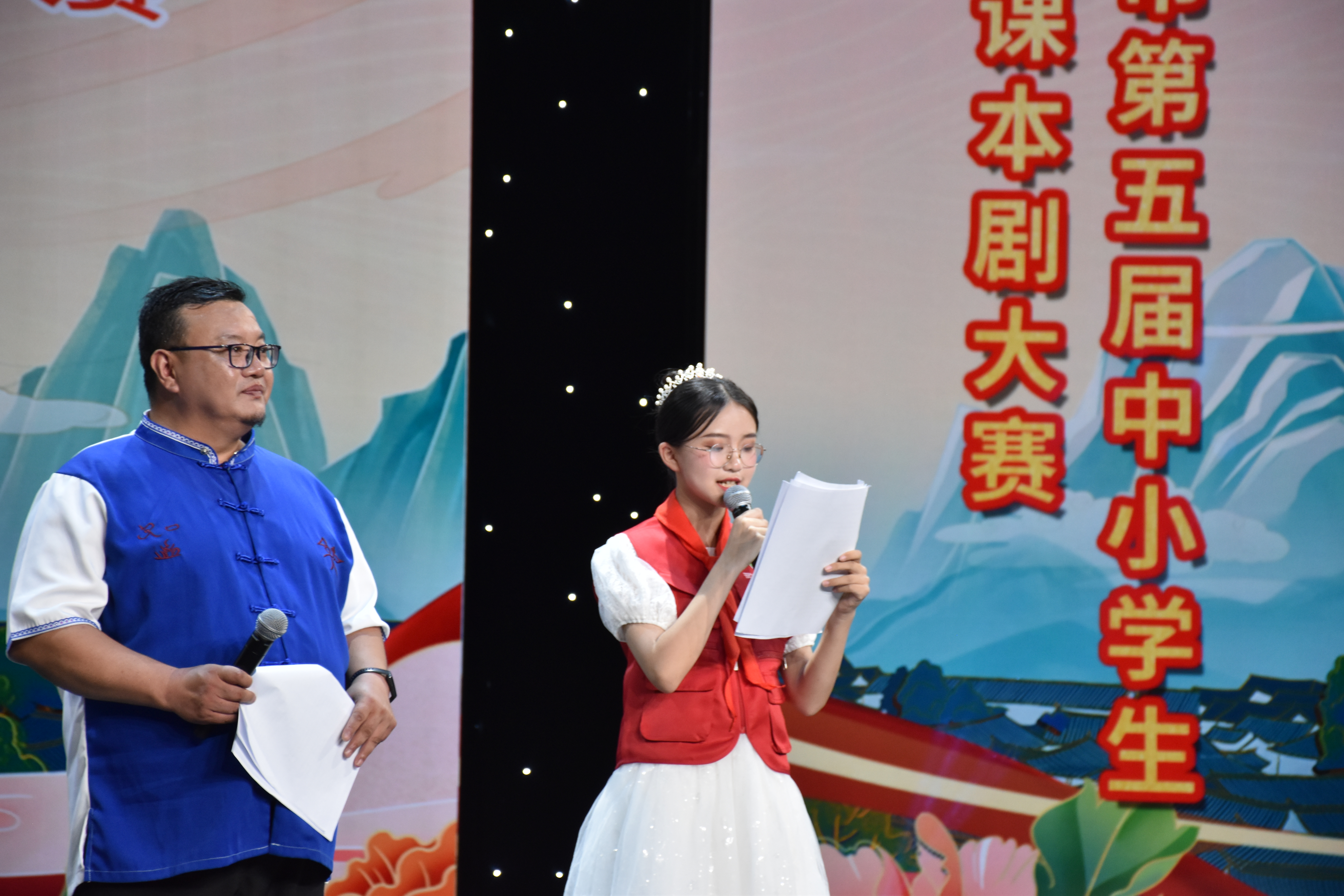 小记者团的小主持人和丽江市融媒体中心主持人一起主持课本剧大赛(李琳拍摄)