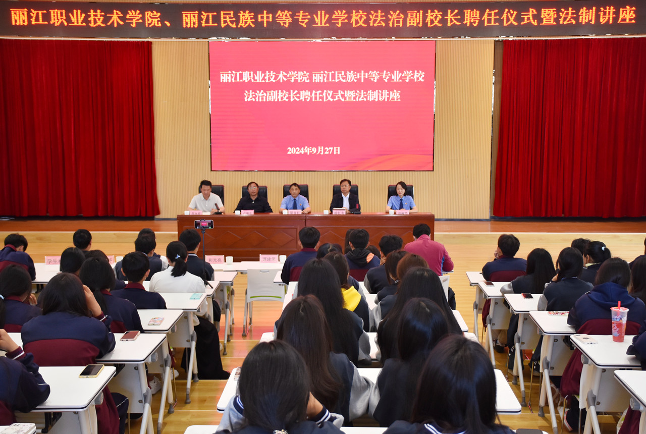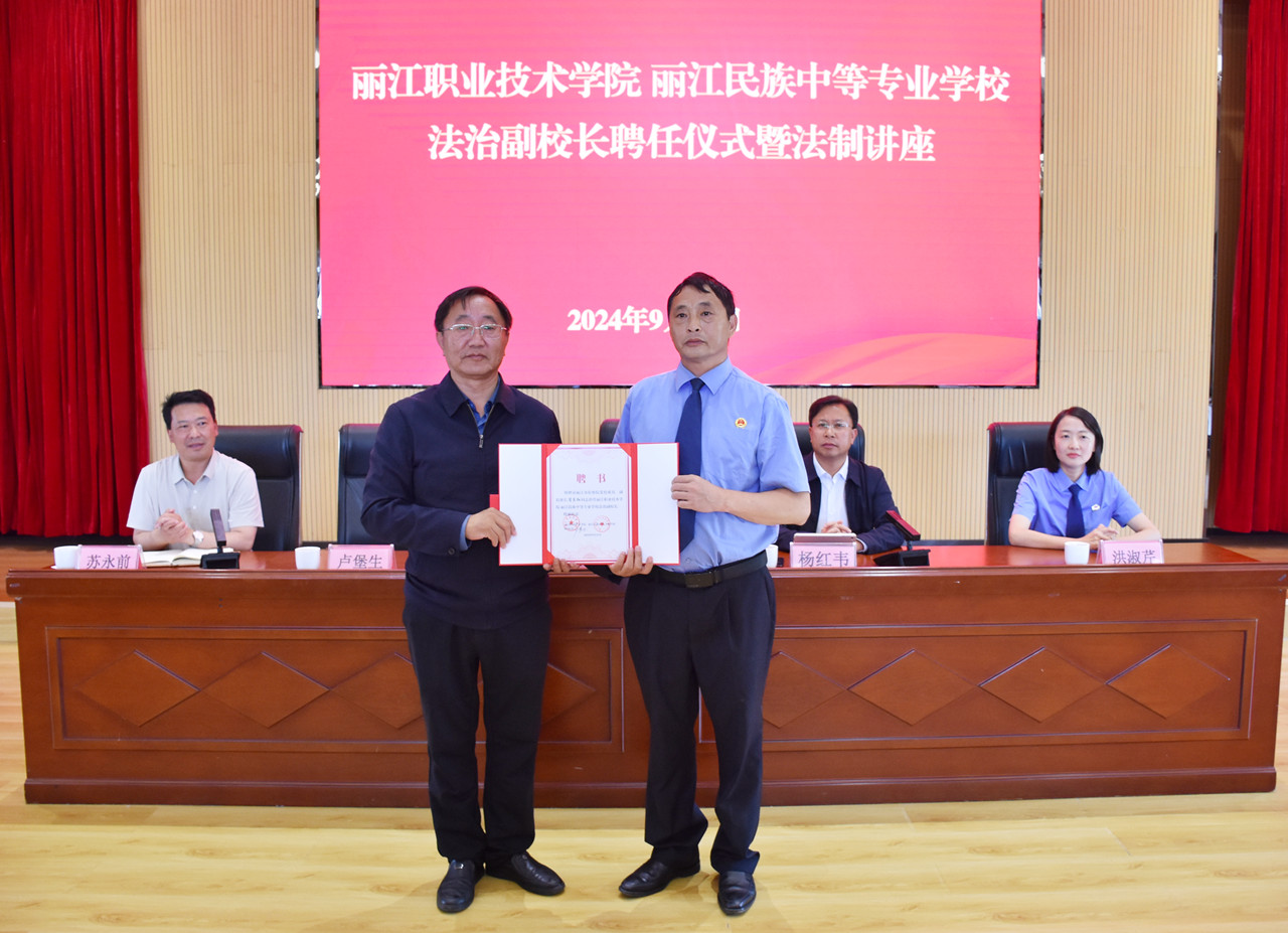 9月27日,丽江职业技术学院、丽江民族中等专业学校举行法治副校长聘任仪式暨法制讲座,聘任市检察院党组成员、副检察长简良红为学校法制副校长并颁发聘书。