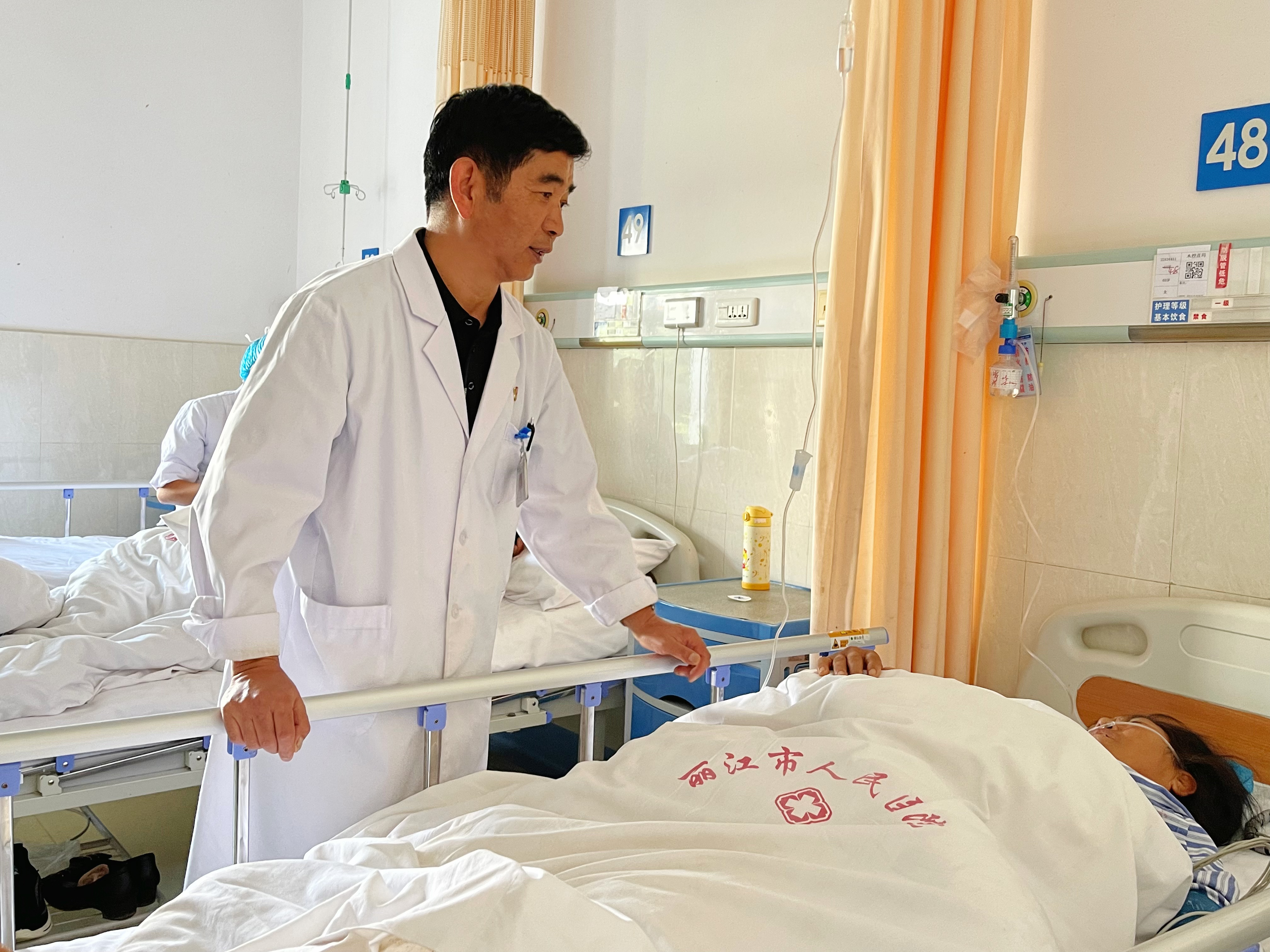 丽江市人民医院外科医生杨承宗与术后病人交流。(徐蕾 摄)