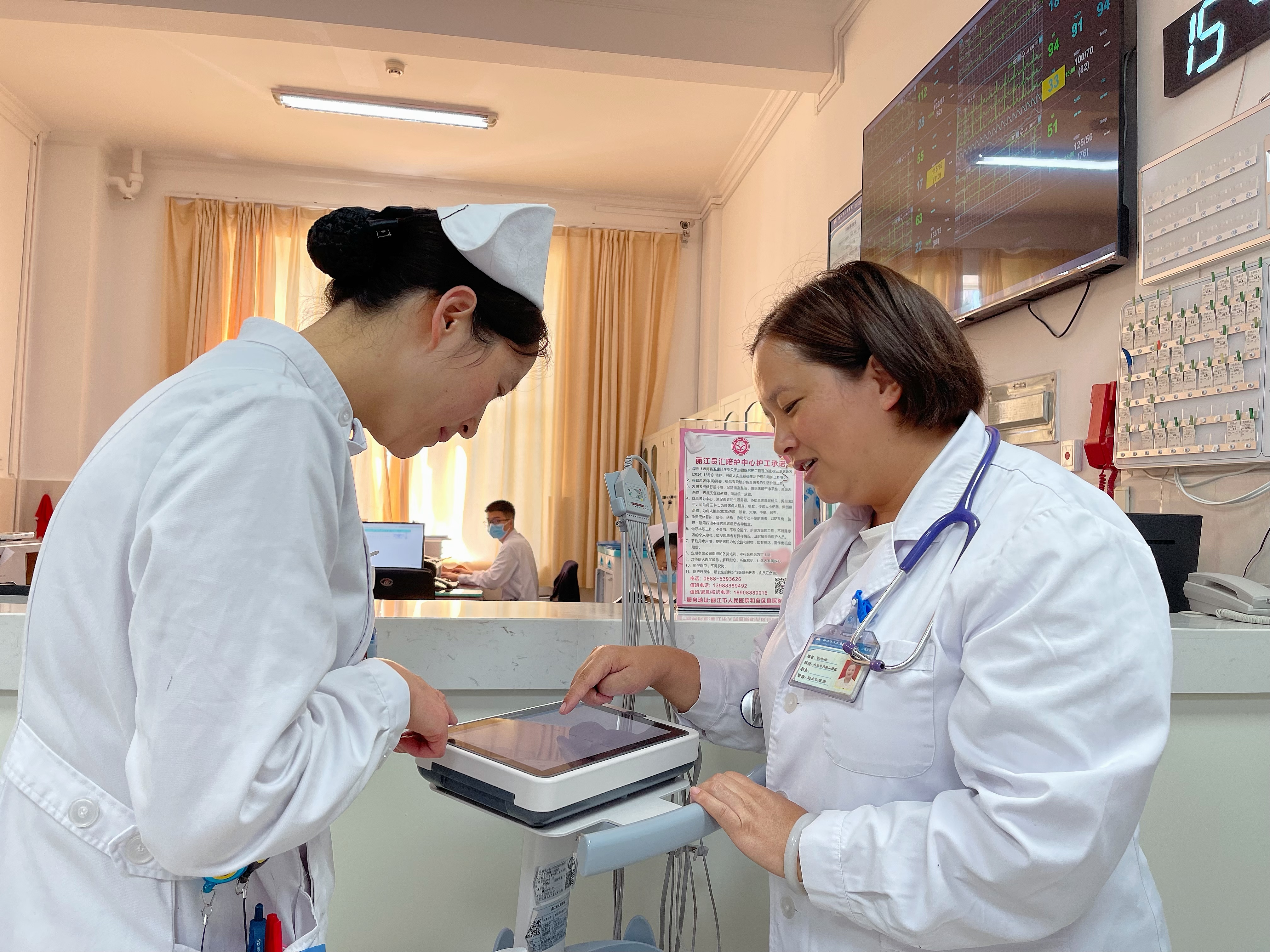 丽江市人民医院心内二科张秀琼医生(右)与护士查看患者心电图。(徐蕾 摄)