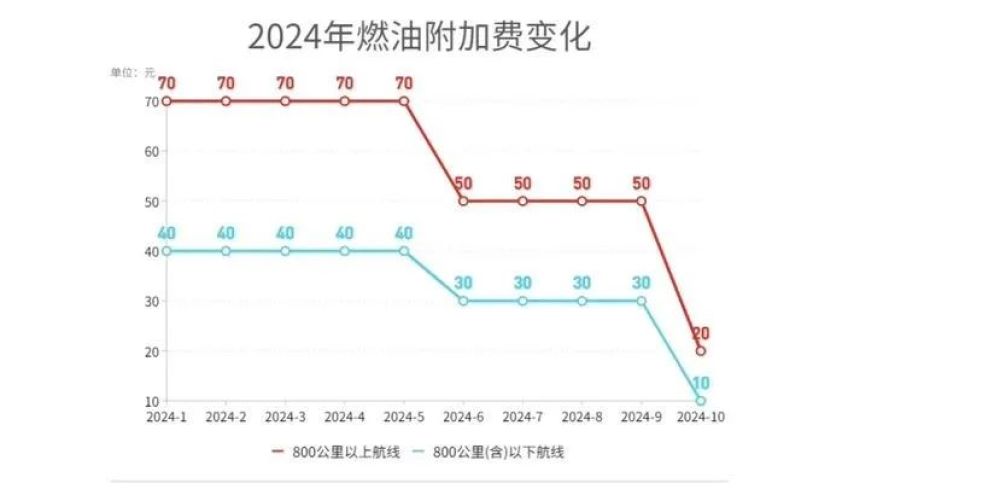 据了解,此次燃油附加费调整,将是继今年1月、6月后的年内第三次下调。需要注意的是,燃油附加费价格按出票时间计算。10月5日之后出票,才能享有新价格。