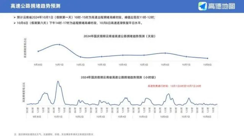 根据高德地图交通大数据预测,全国高速返程高峰出现在10月5日和6日的15时至19时。云南省返程易拥堵缓行的高速主要是G56杭瑞高速、G8511昆磨高速、G85银昆高速、G78汕昆高速等高速的部分路段。