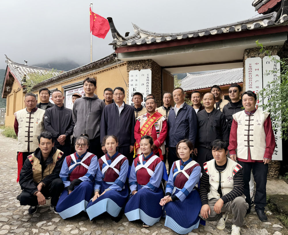 10月5日,记者在玉湖村,拍摄的和旺盛(中)以及玉龙县、白沙镇相关负责人,以及村民的合影。(张小秋摄)