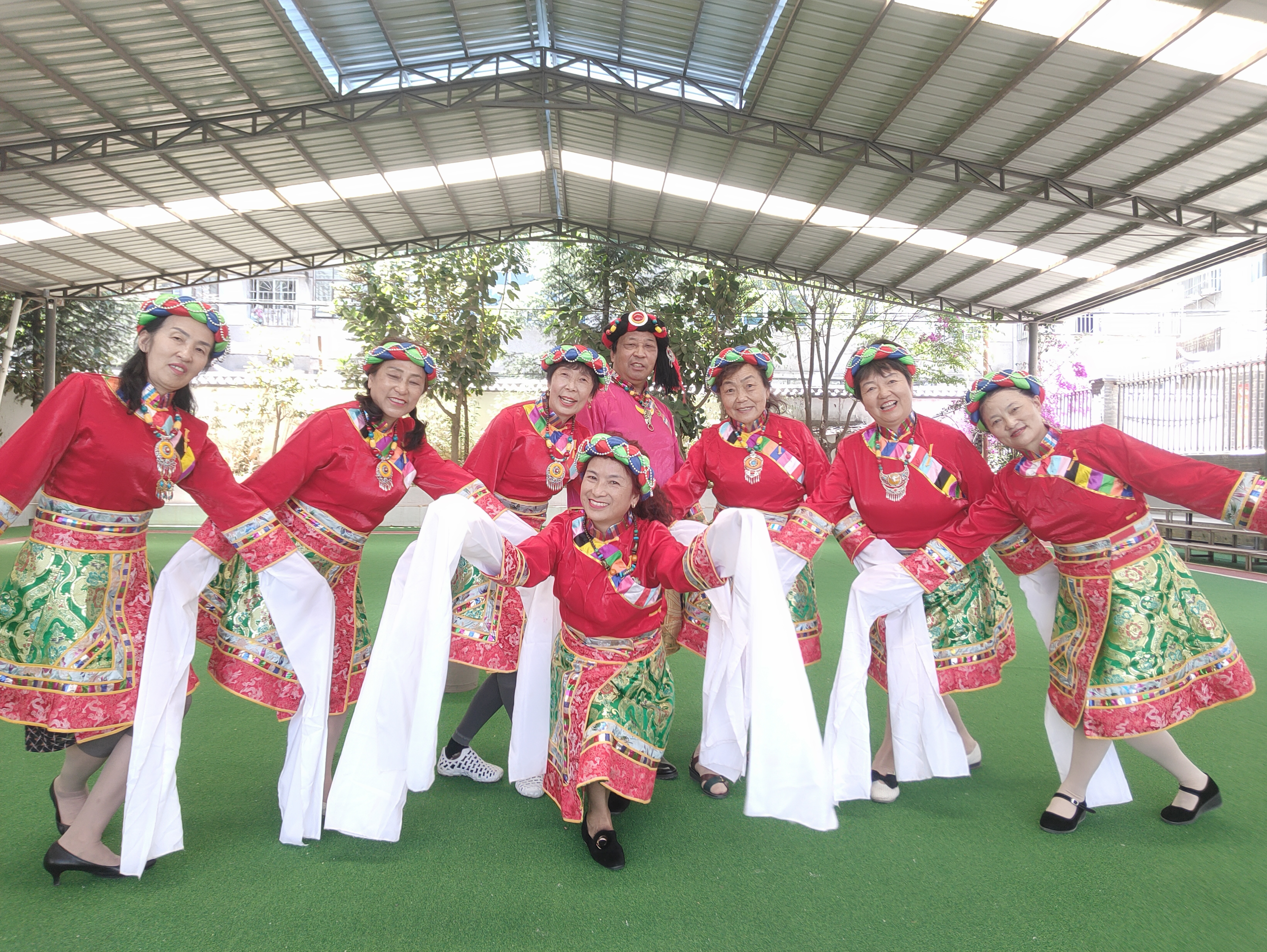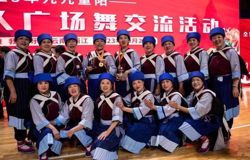 丽江市古城区老体协老年大学爱心艺术团参加广场舞交流活动合影。(受访者 供图)