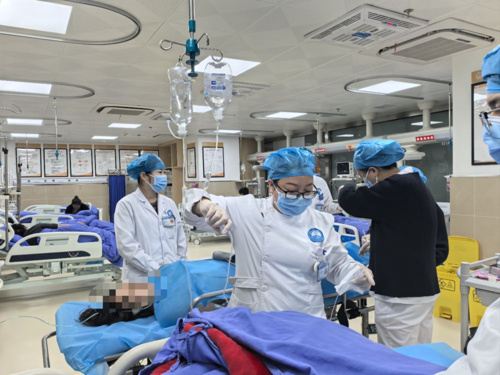 10月6日,在丽江市人民医院急症科抢救室,医护人员给患者输液。(秦文静 摄)