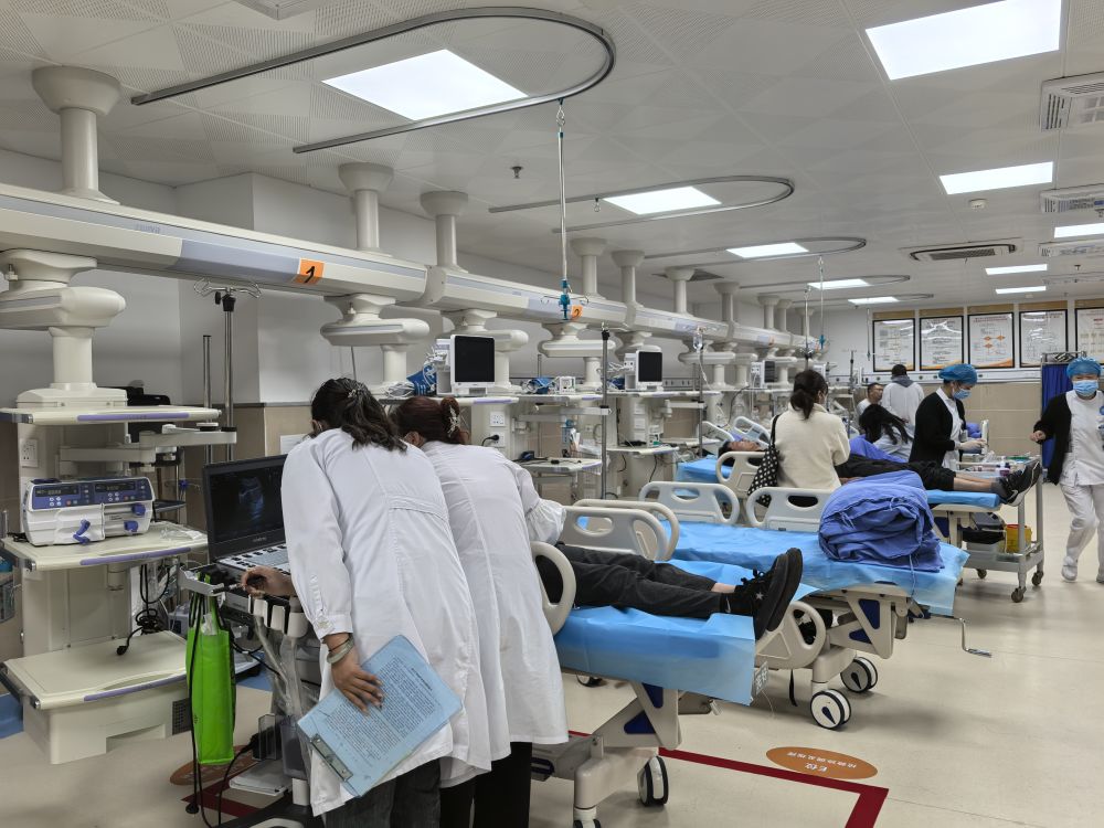 10月6日,丽江市人民医院急诊科抢救室内医护人员忙得不可开交。(秦文静 摄)