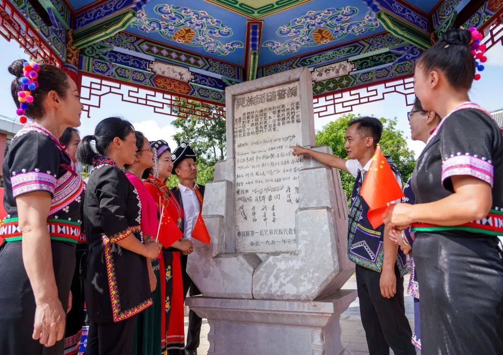 2024年9月25日,在位于云南省普洱市宁洱哈尼族彝族自治县的民族团结园里,当地群众参观民族团结誓词碑。新华社记者 王静颐/摄