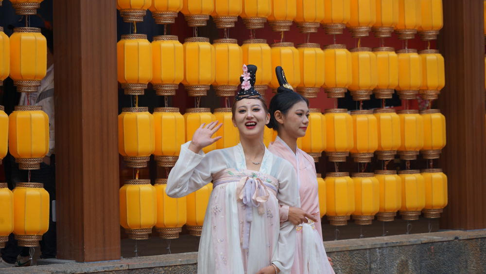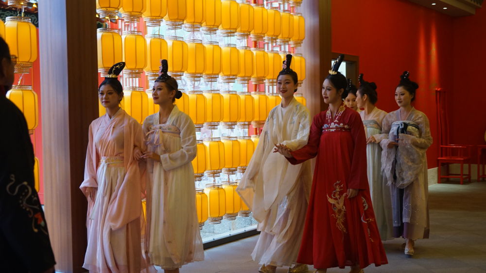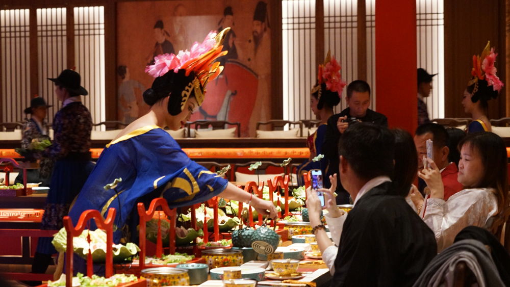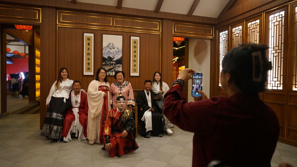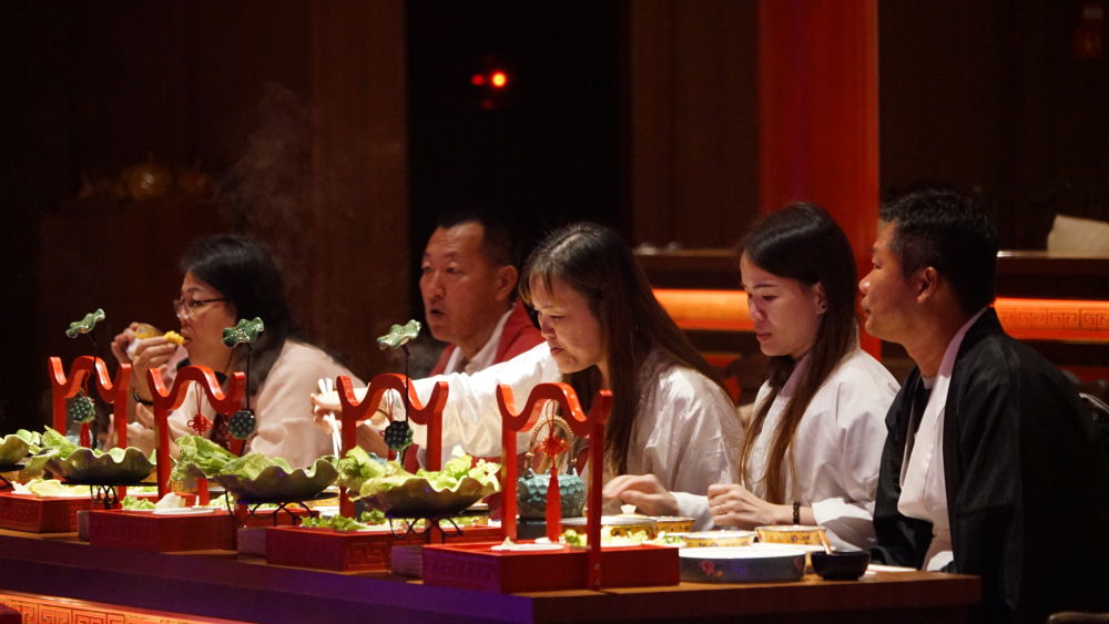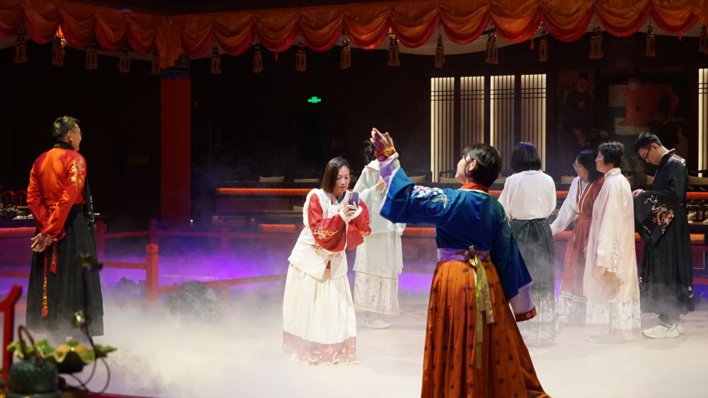 10月11日,游人们身着汉服,沉浸式体验宫廷宴秀。(木红豆 摄)