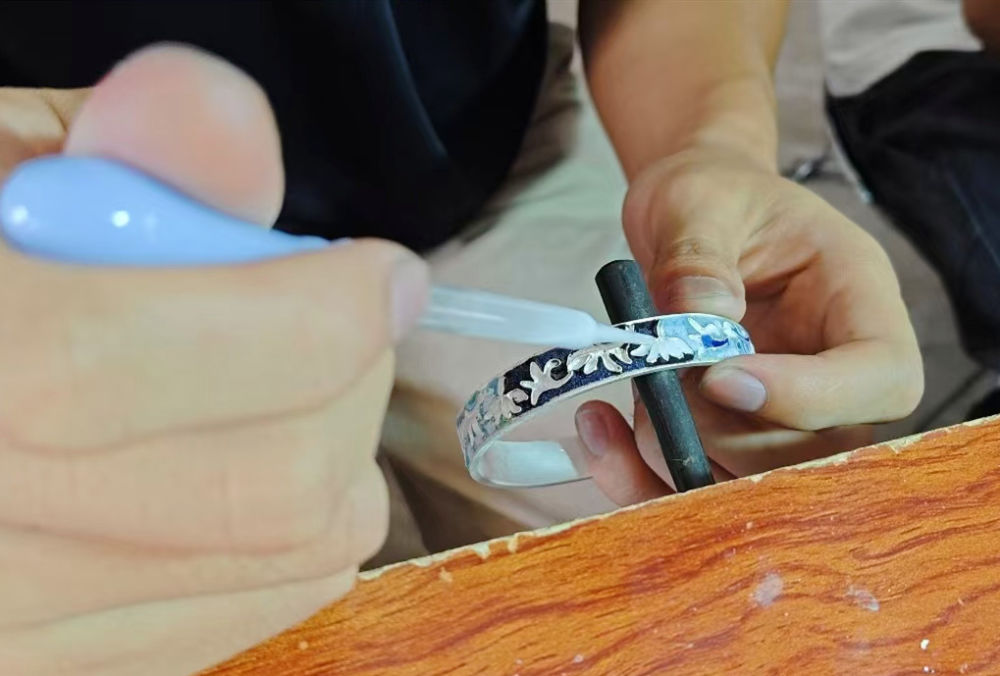 昭通学院珐琅彩银梦之队走访了永胜县三川镇,前往珐琅彩银基地,走访了珐琅彩银器工艺传承的第四代传人谭志平,聆听他讲述珐琅银器的制作故事和技艺传承的艰辛历程。参观了传承基地和工艺制作现场,对基地的历史、现状以及工艺流程进行了全方位的了解。队员们还参与了珐琅彩银器的制作过程,从设计、制胎、掐丝、点蓝、烧蓝到磨光、镀金,每一步都凝聚着工匠们年复一年的不断钻研与汗水。