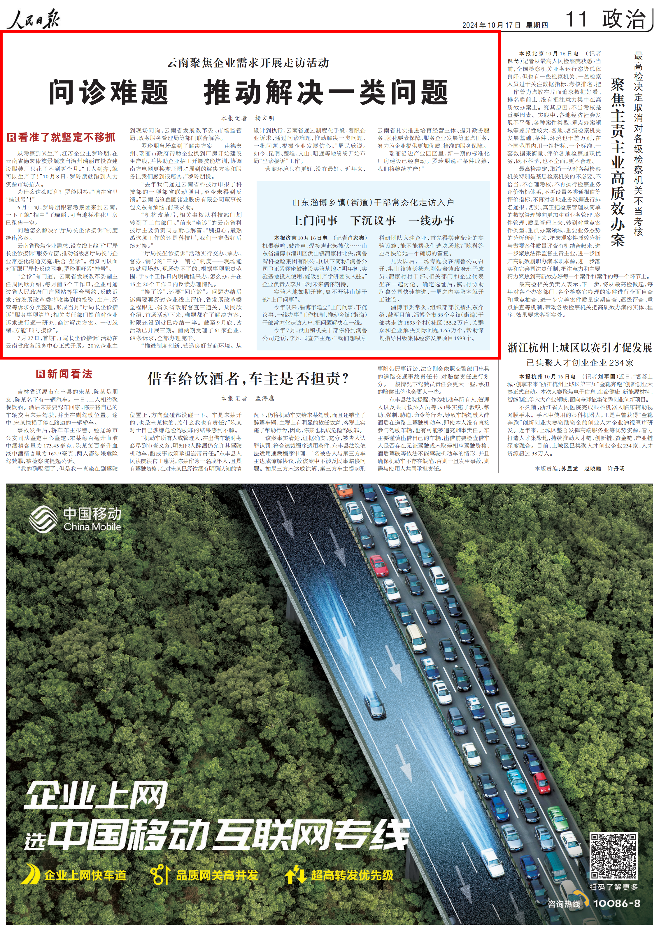 “推进制度创新,营造良好营商环境。从设计到执行,云南省通过制度化手段,着眼企业诉求,通过问诊难题,推动解决一类问题、一批问题,提振企业发展信心。”周民欣说。如今,昆明、楚雄、文山、昭通等地纷纷开始布局“坐诊接诉”工作。