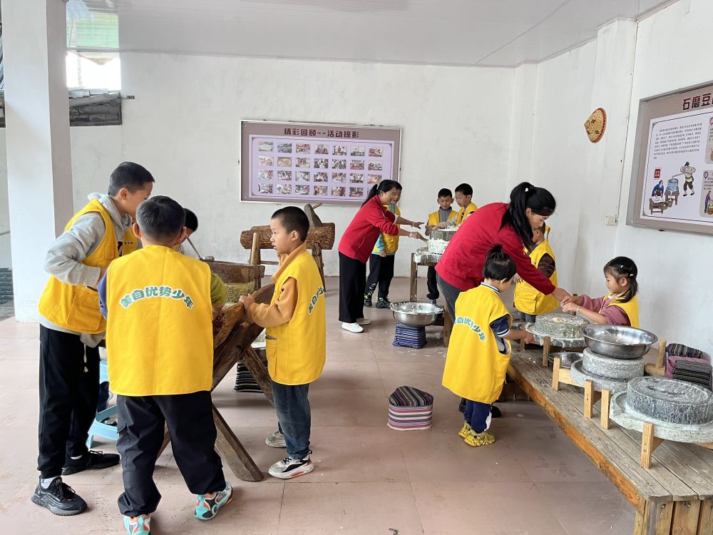 参加研学的学生,在开南研学功能室体验非遗石磨豆腐。(供图)