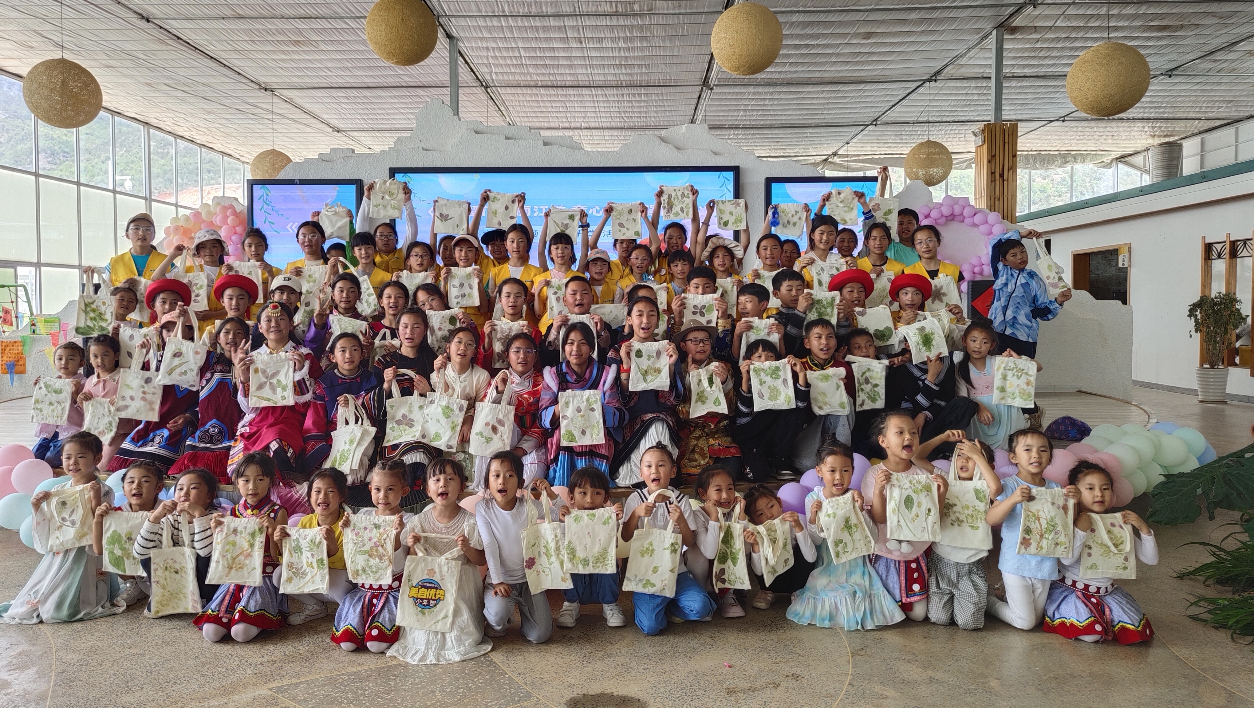 参加研学的学生,在开南基地学习叶画制作并留影。(杨敏 摄)
